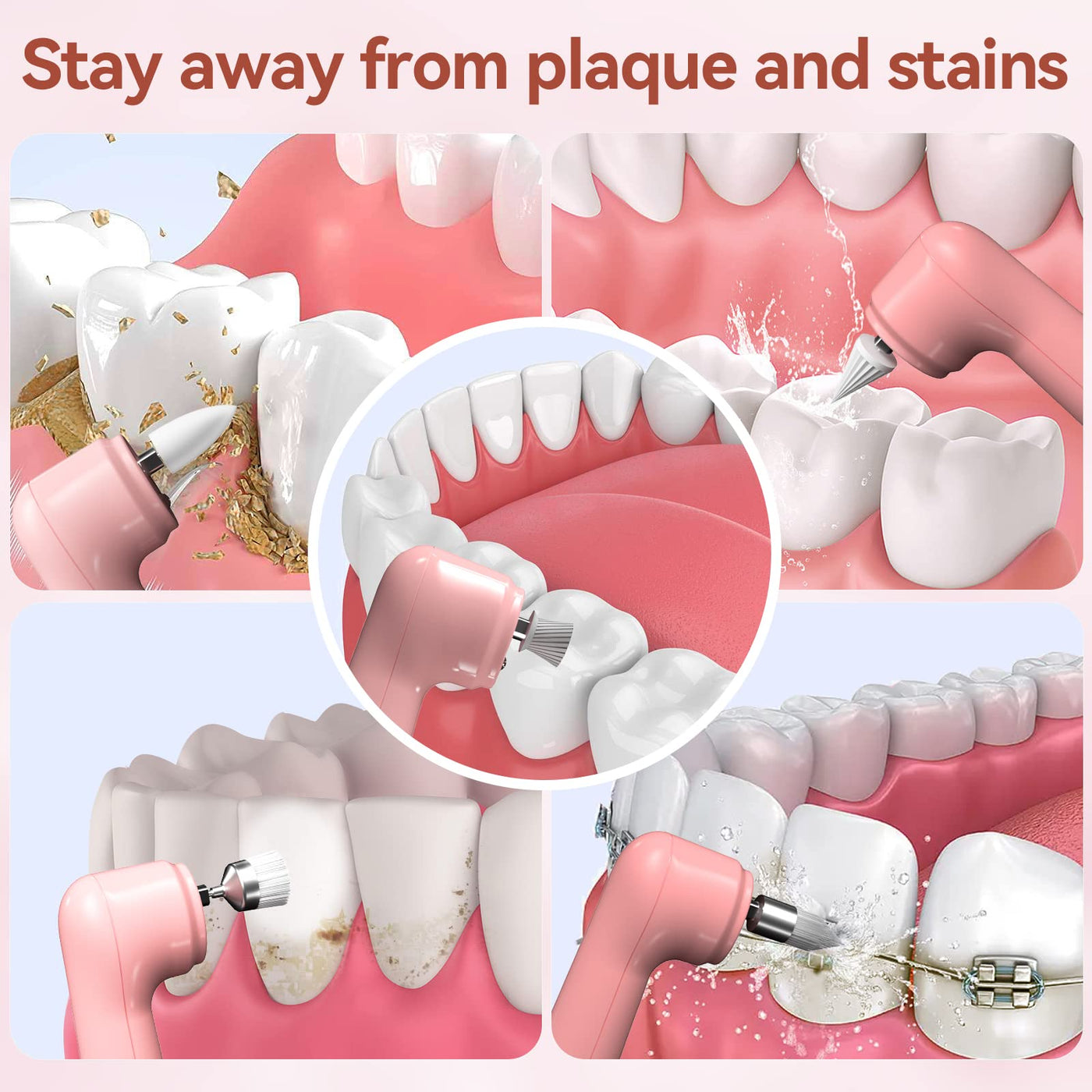 - 5 replacement heads: Tooth Polisher Electric Professional has 5 different replacement heads: 3D silicone tip, umbrella polishing head, flat bristle brush head, pointed bristle brush head, polishing massage cup. The unique design easily removes stubborn stains, flat stains, and interdental stains from teeth, making teeth smoother and shinier