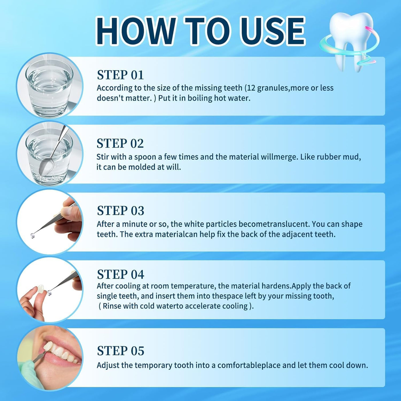 - Easy to use: By placing the beads into boiling water, they will soften quckly, allowing you to form a replacement tooth.