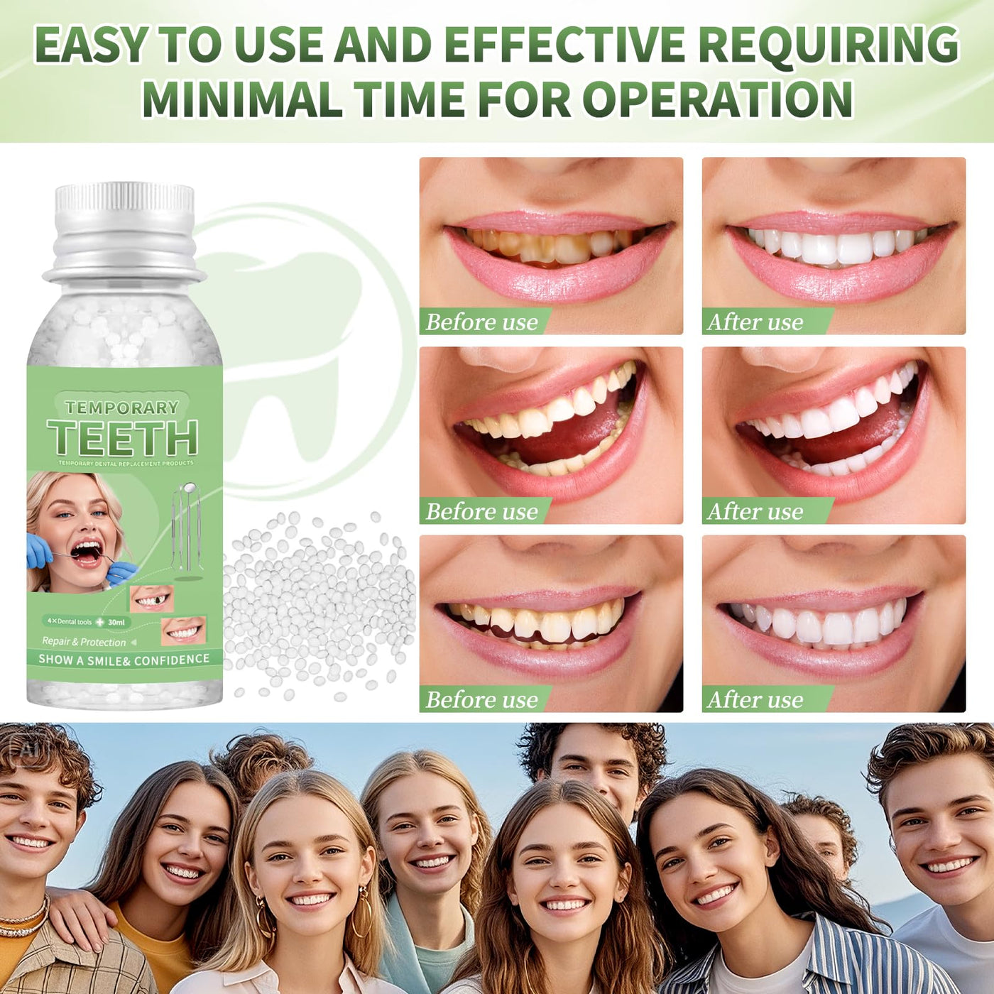 - [Safe & High Quality] - The tooth repair kit uses thermoformed beads made from environmentally friendly polymer plastic. Safe and odourless, you can use it with confidence and it will give you the power to smile again.