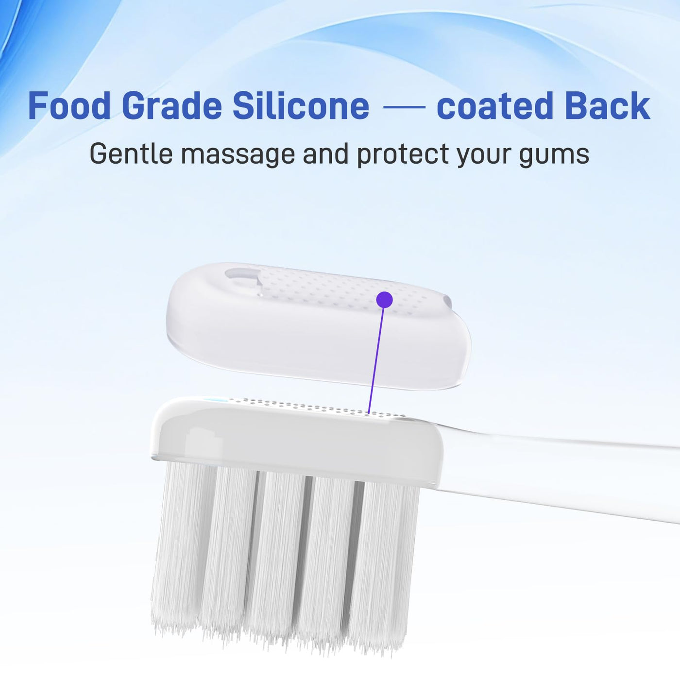 - Gum-Shield Silicone Backing - Equipped with soft silicone-coated backside on toothbrush head, protect delicate gums from abrasion during brushing.