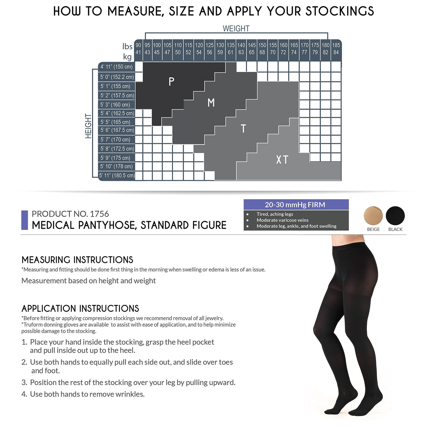 Truform 1756 pantyhose provide firm graduated compression to help energize the legs and reduce discomfort. The 20-30 mmHg firm compression level is great for leg fatigue and slight ankle, leg and foot swelling. They provide long-lasting support that appeals to today's active, fashion conscious woman and serve excellently as both business and casual wear. Truform stockings, socks, and pantyhose feature Graduated Compression Technology, which delivers a compressive action to the leg that is greatest at the ankle, then gradually decreases toward the heart. This graduated compression provides two primary benefits to the legs: increased pressure on tissues beneath the skin helps reduce and prevent swelling for the wearer, and the compression action helps control the size of the superficial veins that lie just beneath the skin; preventing the slowing of blood flow so it can flow more quickly up the leg and back toward the heart. They feature five intervals of therapeutic graduated compression, doctor-recommended to help relieve tired, heavy, and aching legs, aid in the treatment of spider veins, varicose veins, and swelling of the leg and feet; ideal when sitting or standing for long periods of time. We take the extra time and effort necessary to insure a therapeutically effective, comfortable fit. The combination of state-of-the- art materials and equipment, plus knitting know-how sets Truform apart from the crowd to make your legs look and feel great. Manufacturer Contact Information 3960 Rosslyn Dr, Cincinnati, OH 45209