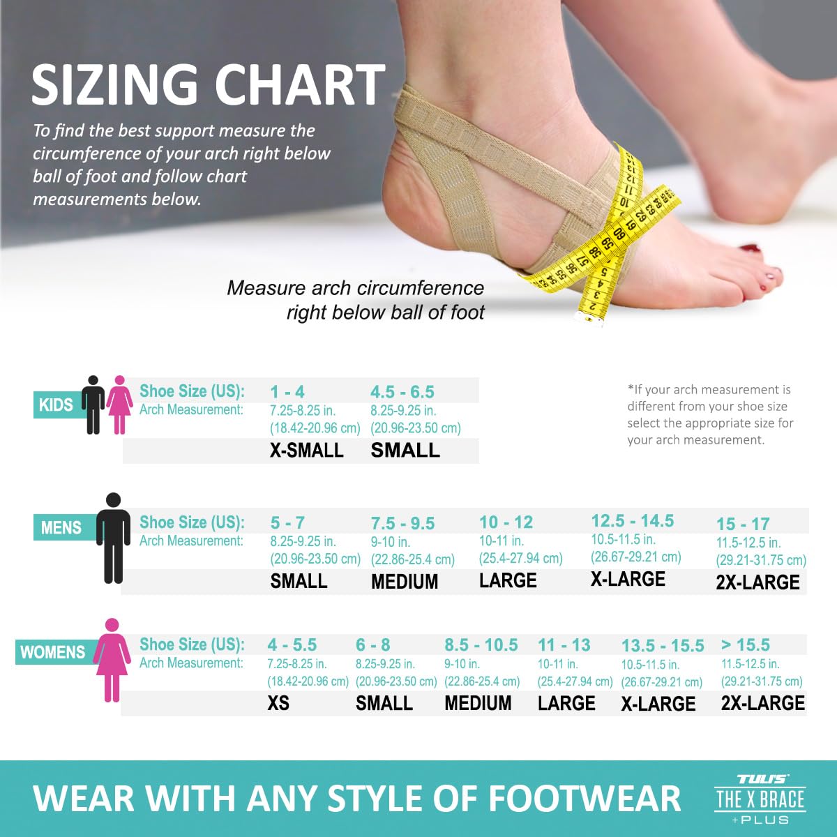 - MULTI-USE FUNCTION You can wear the X Brace Plus with shoes or barefoot! The X Brace Plus will support your arch and prevent heel pain, even when worn with flip flops, sandals, or high heels.