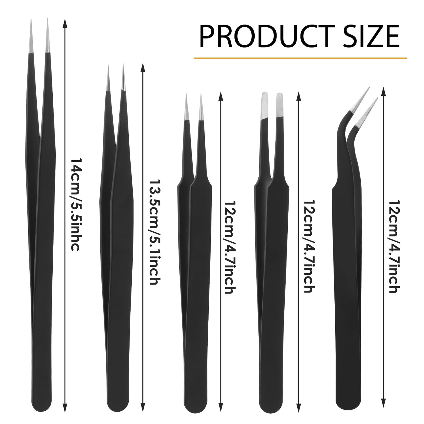 - Size information: Stainless steel tweezers are available in the following sizes: pointed tweezers: 14 cm/13.5 cm/12 cm, curved tweezers: 12 cm, flat tweezers: 12 cm. Choosing the right size tweezers can save you a lot of time.