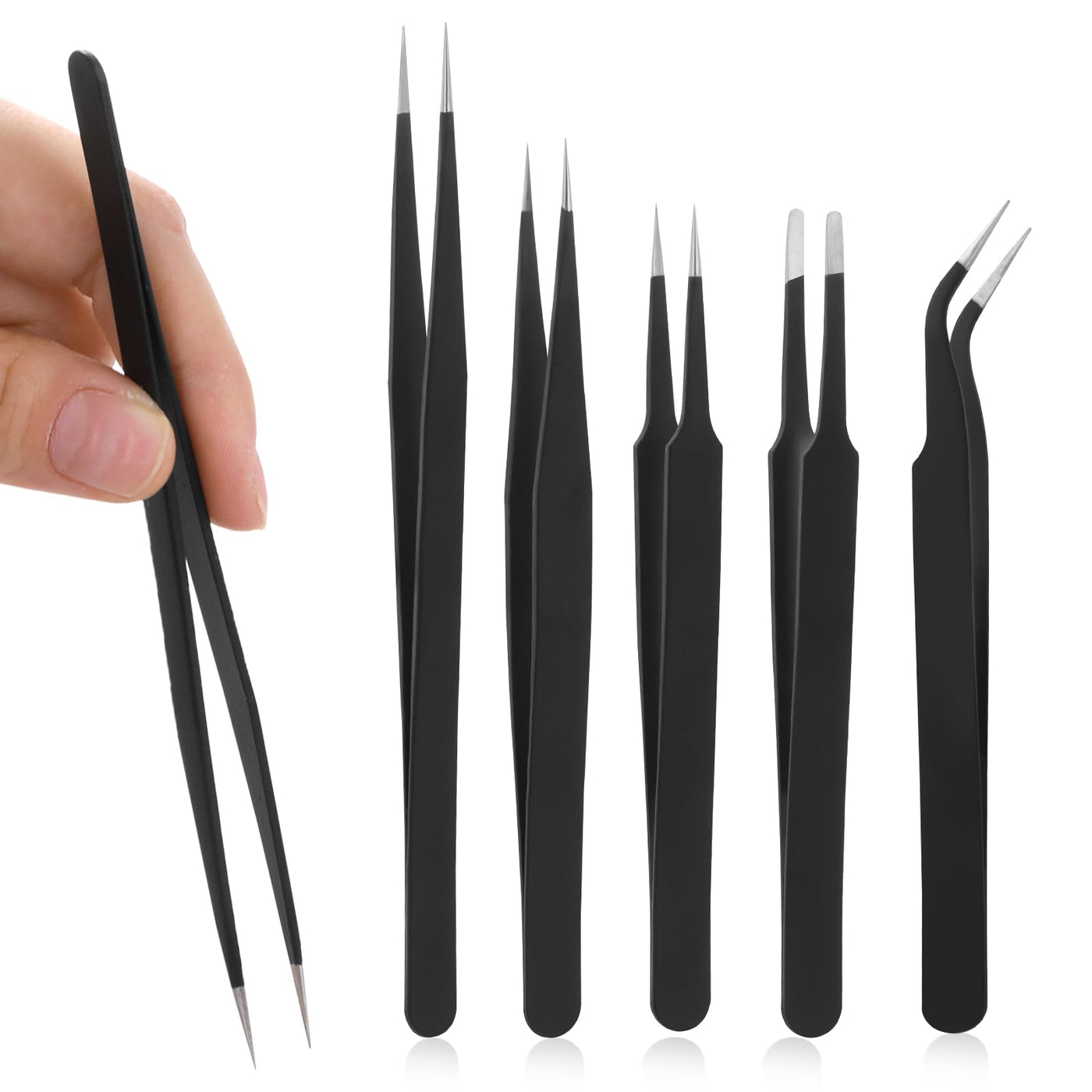 Tweezers Set, 5 Pieces Bead Tweezers 5 Models Stainless Steel Tweezers Anti-Static Precision Tweezers Set for Jewelry Making, DIY Crafts, Electronic Repairs, Manicure Tools (Black)