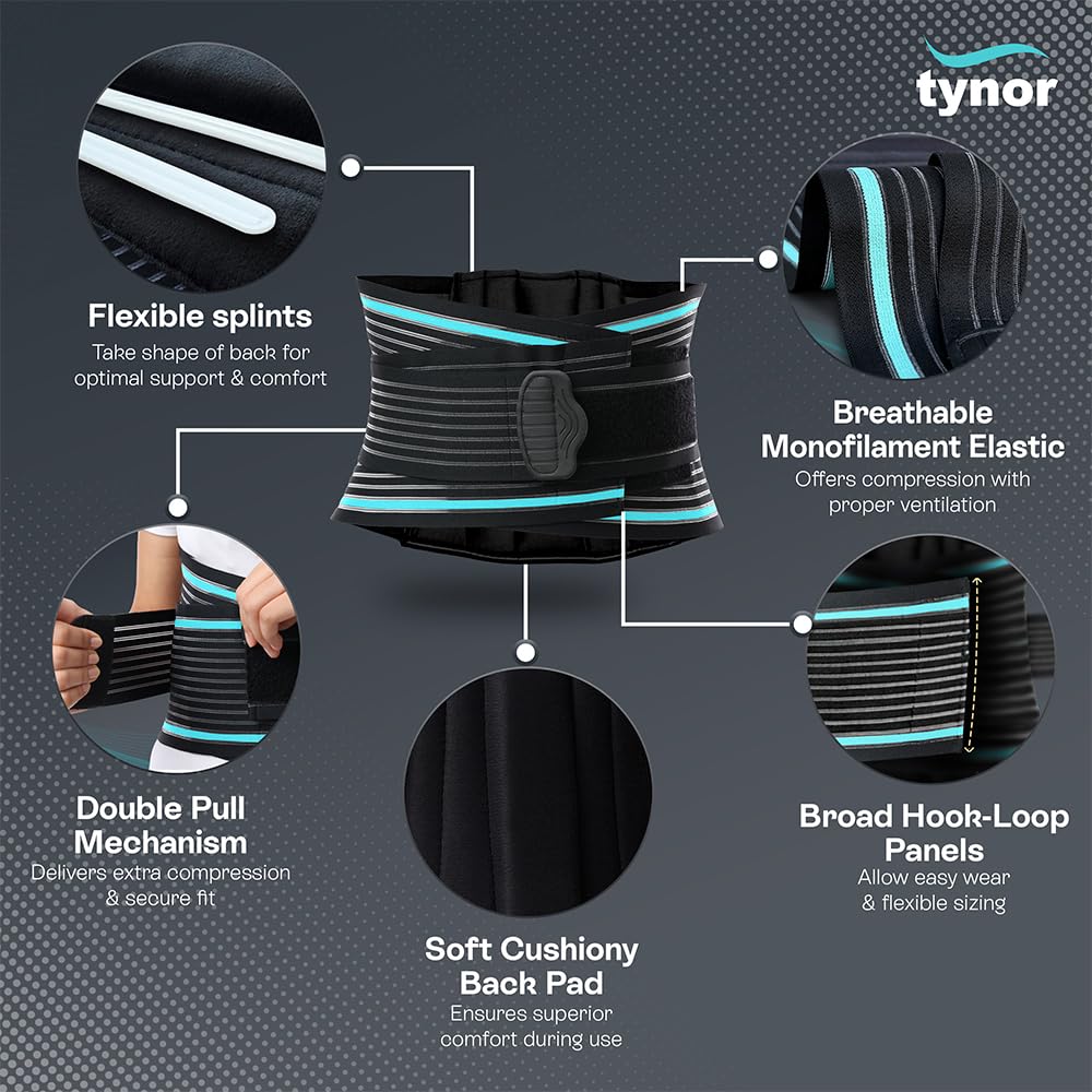 - CONFORMS TO BODY SHAPE: Featuring flexi back splints, the Tynor Back Support Belt conforms to the body's natural contours, providing effective immobilization and support. This ergonomic design of lower back brace helps distribute pressure evenly across the lumbar area, promoting proper alignment and providing support during activities or rest.