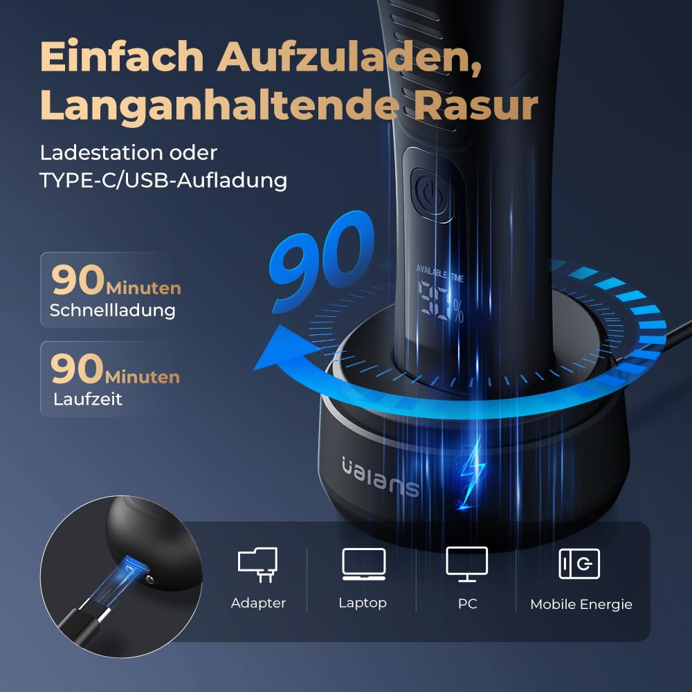 - Universal Type-C charging interface and LED light This men's private trimmer uses Type-C charging and gets a charging base that can be charged directly via USB or with a charging base. It only takes 90 minutes to fully charge and can last at least 90 minutes. Battery life is solid. Note: Cannot be used while charging. A special integrated LED light makes trimming easier in low light conditions and ensures a close and safe shave