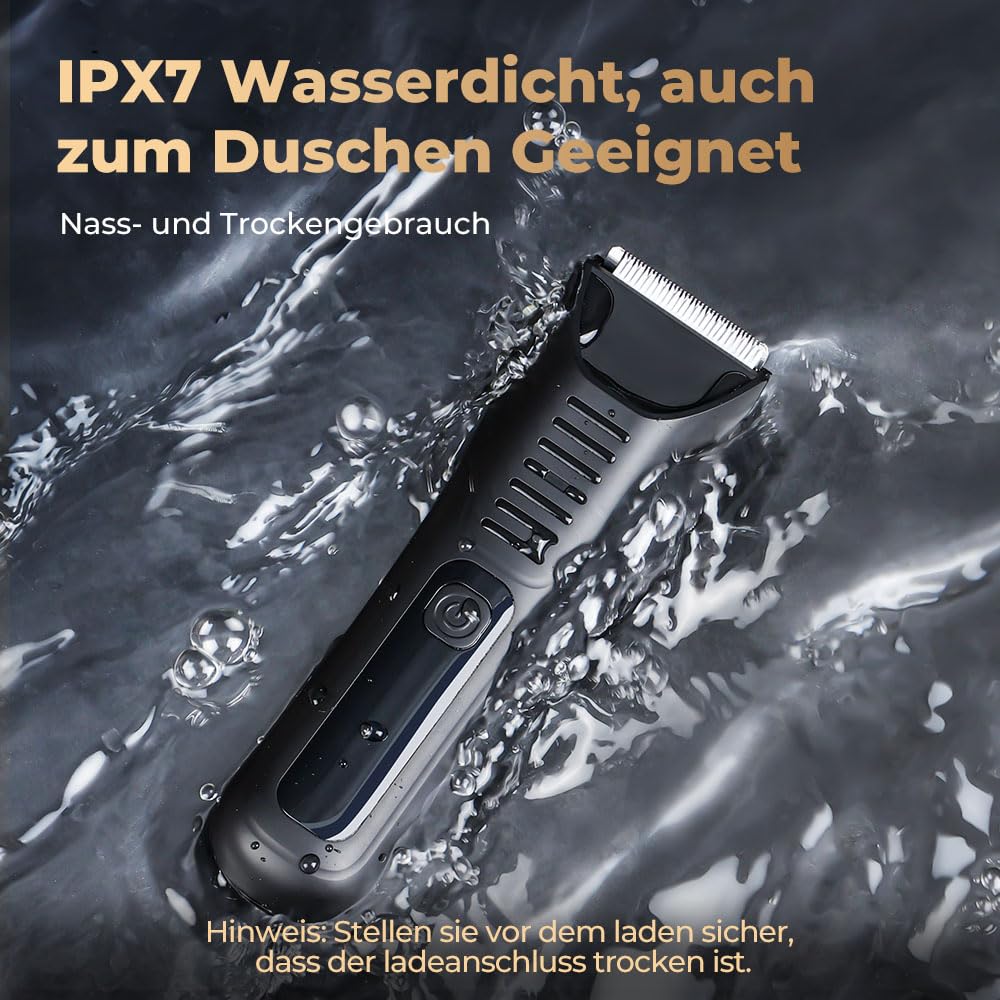 - Waterproof, Wet and Dry Use, Ergonomic Design The men's personal trimmer is IPX7 waterproof and can be used dry or wet, with a removable head that allows you to shave in the shower or magnetically unwind directly under the tap. Electric trimmer. Thanks to the compact body and ergonomic design, you can hold it comfortably to trim any part of your body, such as: E.g. armpits, bikini area, intimate area, etc.