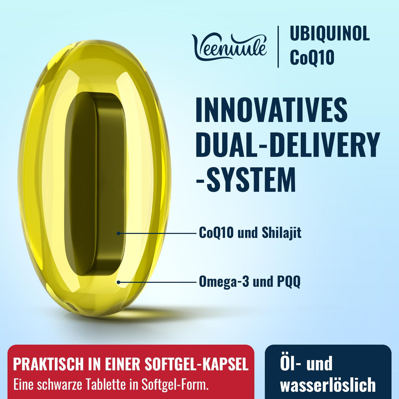 - DUAL DELIVERY SYSTEM: Veenuule introduces an innovative dual delivery system that integrates tablets into soft gel capsules. This innovative approach combines two methods of nutrient delivery for comprehensive nutrition. Tablets embedded in soft gel capsules ensure easy swallowing and gradual release of ingredients (Ubiquinol CoQ10, Shilajit, Omega-3, PQQ) during digestion, promoting absorption and providing optimal results.