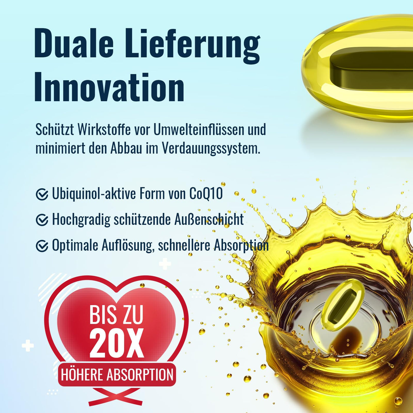 - 20X INCREASE IN ABSORPTION: Each serving contains 600 milligrams of ubiquinol coenzyme Q10, which forms the foundation of our product. This active form of Coenzyme Q10 is crucial for energy. By prioritizing highly concentrated ubiquinol coenzyme Q10. When combined with the dual delivery system, the absorption rate is significantly increased by 20 times compared to traditional methods.