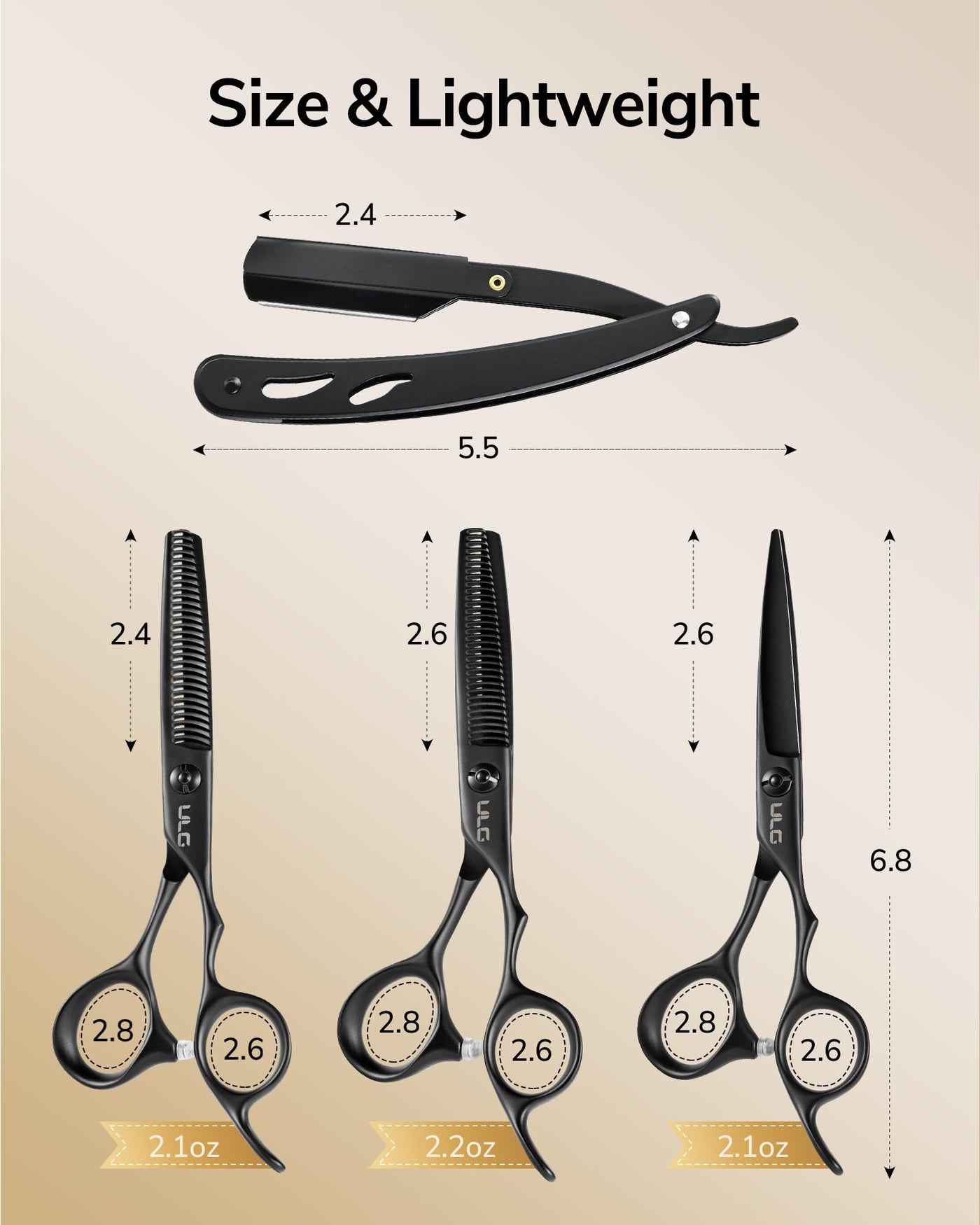 - LIGHTWEIGHT: Weighing just 2.12.2 oz, these scissors are light as a feather, making them perfect for long hours of use. Whether youre a beginner or a seasoned pro, the lightweight design enables exquisite techniques like cutting, texturing, thinning, and blending with ease. Switch between 3 scissors quickly to streamline your work.