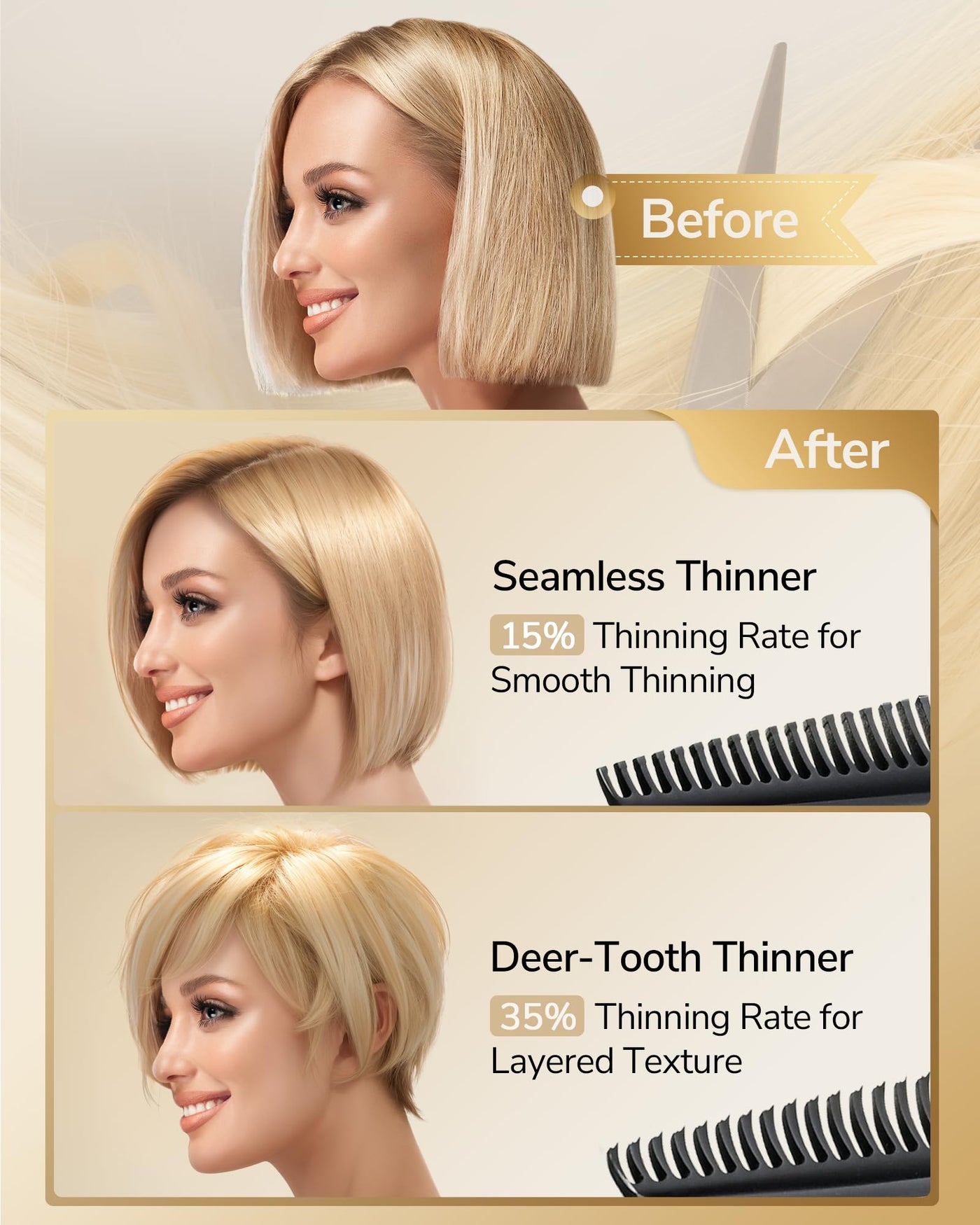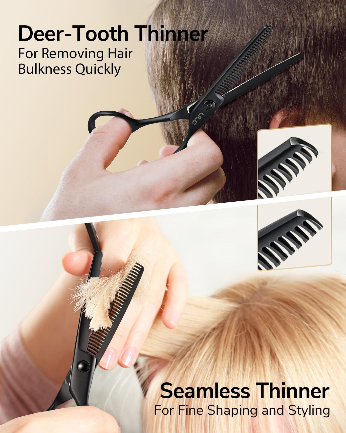 - ERGONOMIC DESIGN: Designed with offset handles to minimize wrist strain and finger fatigue, these thinning scissors offer optimal comfort for long cutting sessions. The finger-shaped contours and bent thumb ring naturally guide your hand, ensuring proper grip even if you're new to hair cutting.