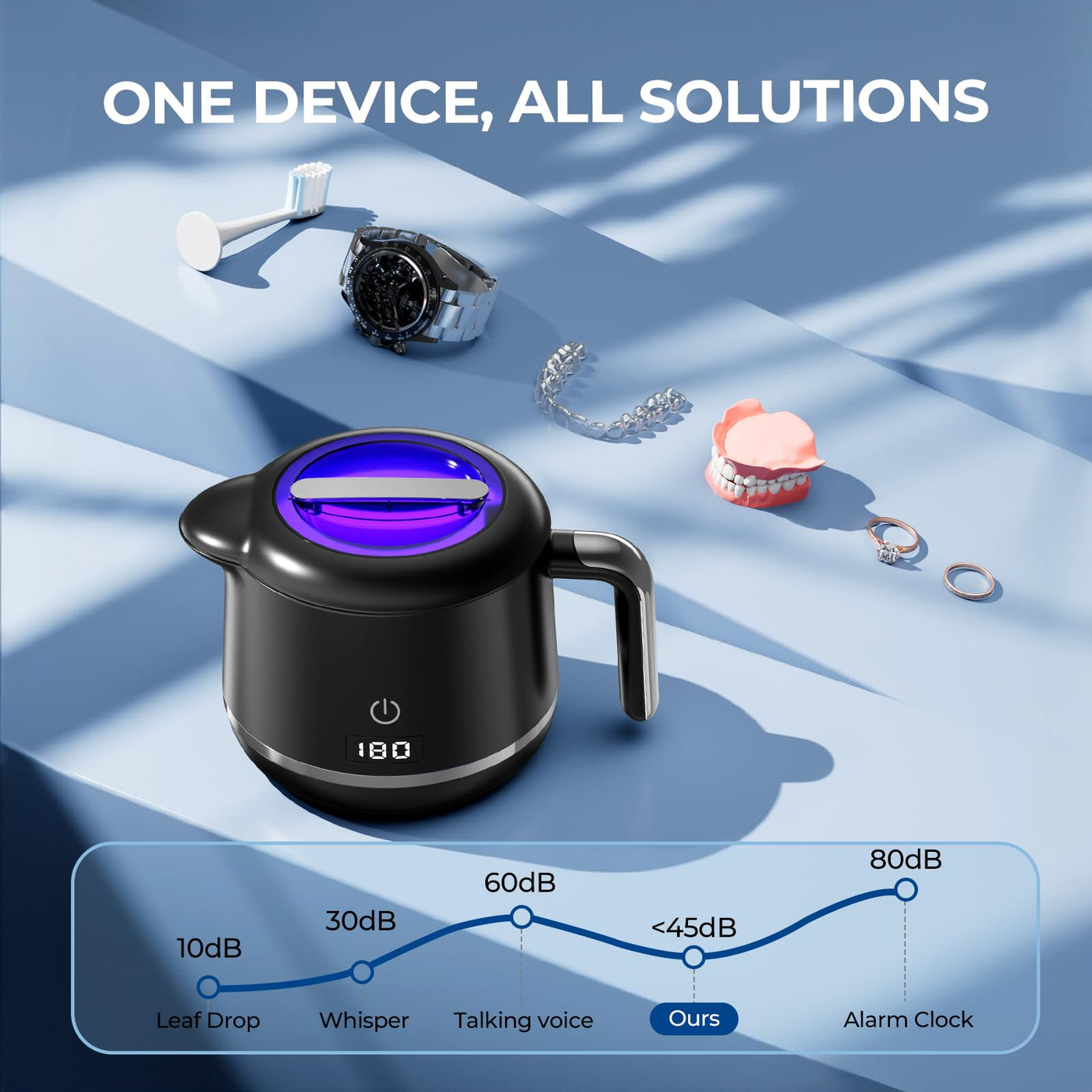 - Large Capacity & Portable:Spacious 200ml capacity comfortably cleans aligners, retainers, and mouth guards simultaneously, with tweezers, while doubling as a powerful ultrasonic jewelry cleaner for rings, necklaces, and small accessories. Compact kettle design, convenient for travel use