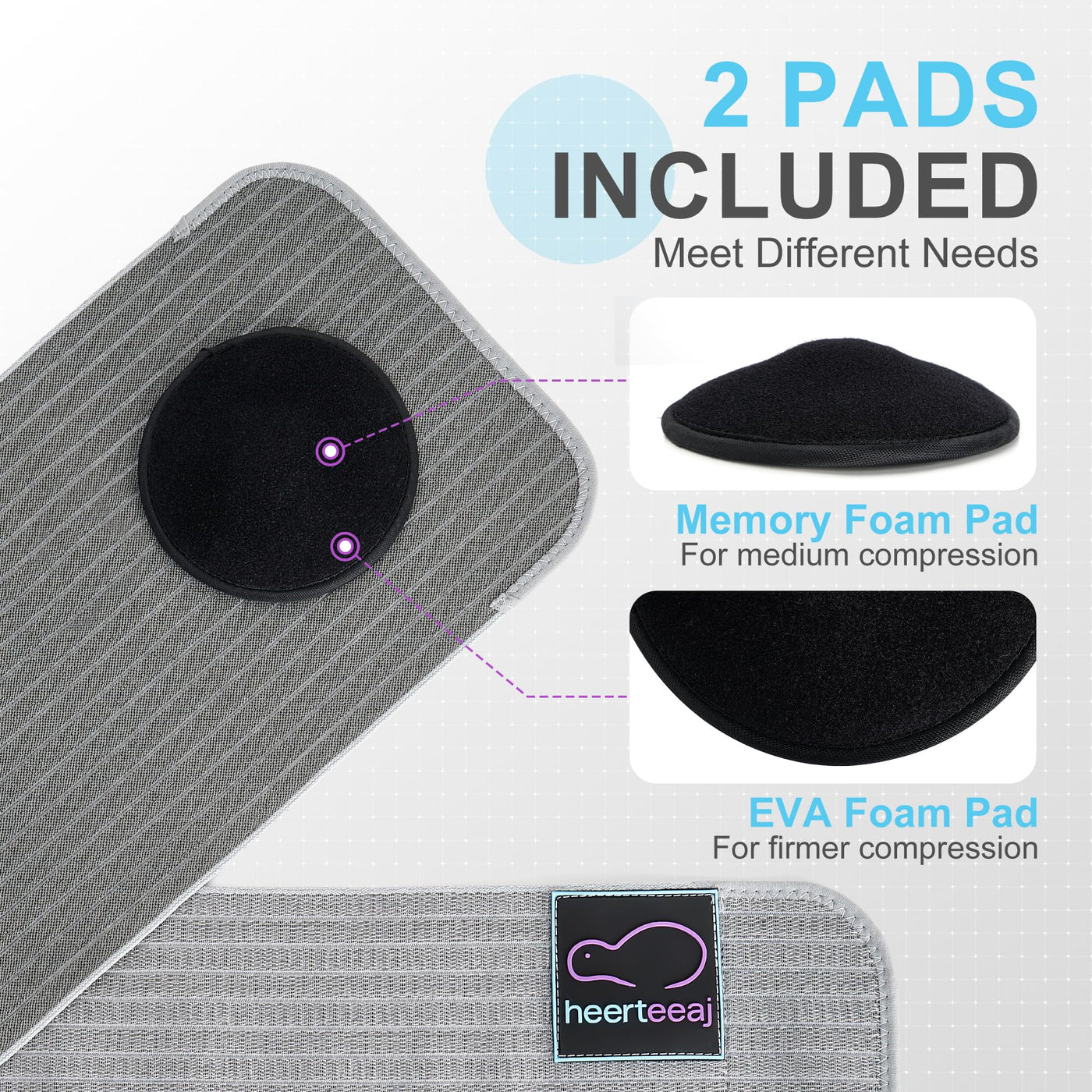 - FULLY ADJUSTABLE COMFORT - WITH 2 DIFFERENT COMPRESSION PADS - Unlike our competitors, our hernia belt for women and men provides 2 compression pads of differing materials and purposes. Choose your preferred firmness level to create pressure that prevents your hernia from popping out. while the memory foam pad is softer, more suitable for mild discomfort with our hernia wrap.
