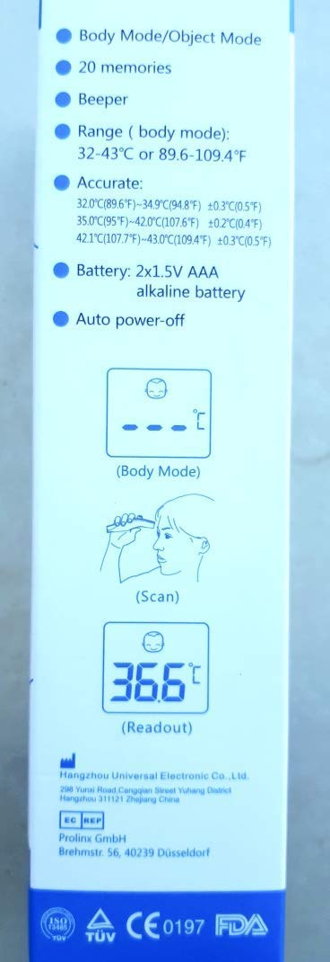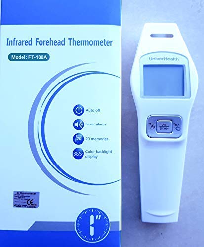 UniverHealth FT-100A infrared front thermometer for detecting the Body Temperature, White Useful for detecting temperature, suitable for Babies, children and adults. Accurate and precise, bright display and automatic shutdown. Also for recording the ambient temperature suitable. Batteries not included