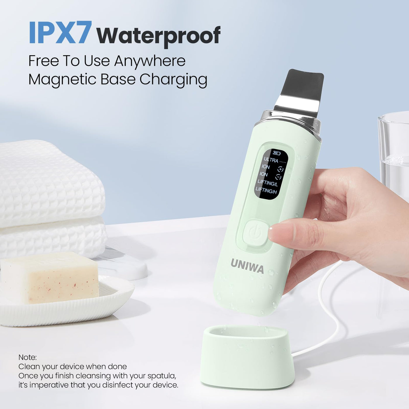 UNIWA Skin Scrubber Face Spatula, Skin Scrubber Pore Cleaner Blackhead Remover Tool for Deep Facial Cleansing - 4 Modes, Face Spatula with USB Charger, LCD Display, IPX7 Waterproof -Green