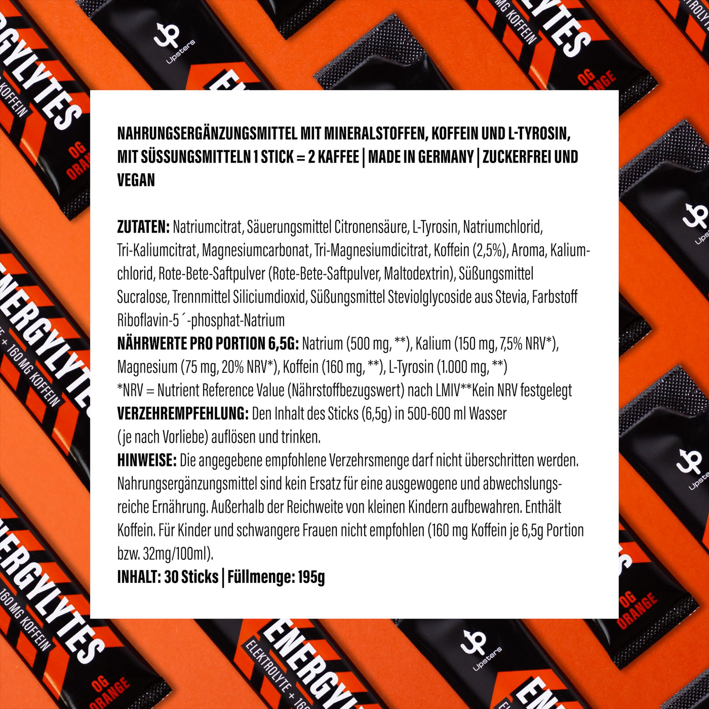 Upsters Energylytes I Electrolyte powder with 160 mg caffeine I Energy drink I Concentration I 30 portions for hydration I Sugar-free and with L-tyrosine I For sports & parties I Orange OG Orange
