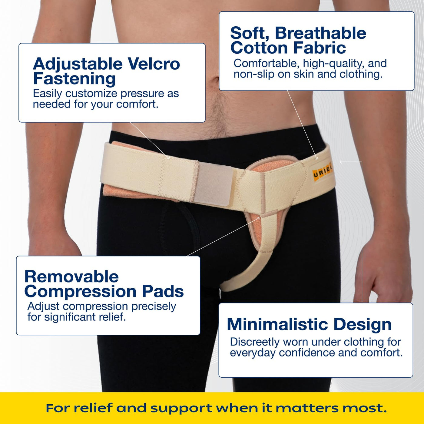 - Reliable Hernia Support: The URIEL Hernia Belt for men Inguinal provides effective support and pressure to keep your hernia in place, offering immediate relief from discomfort. This hernia belt for men inguinal is ideal for men seeking a non-invasive solution and effective inguinal hernia support.
