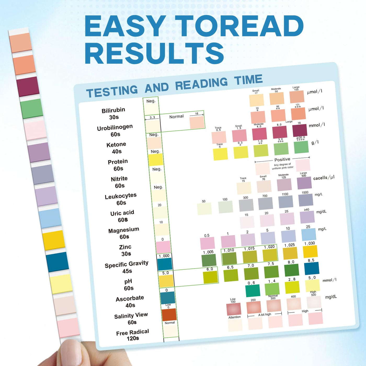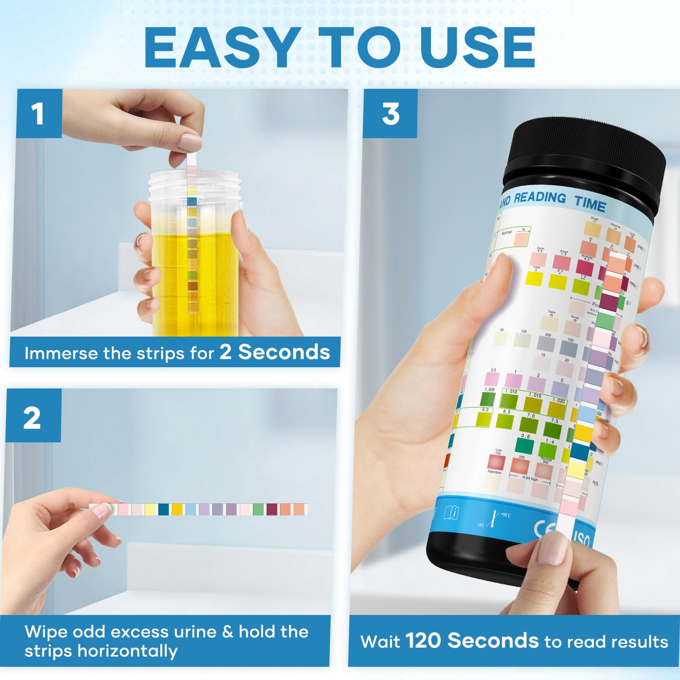 - Easy to Use & Results in 60 Seconds: Urine analysis test strips allow you to take a quick test at home, with results coming back in as little as 60 seconds, so you don't need to make a doctor's appointment every time to get an accurate reading of each parameter
