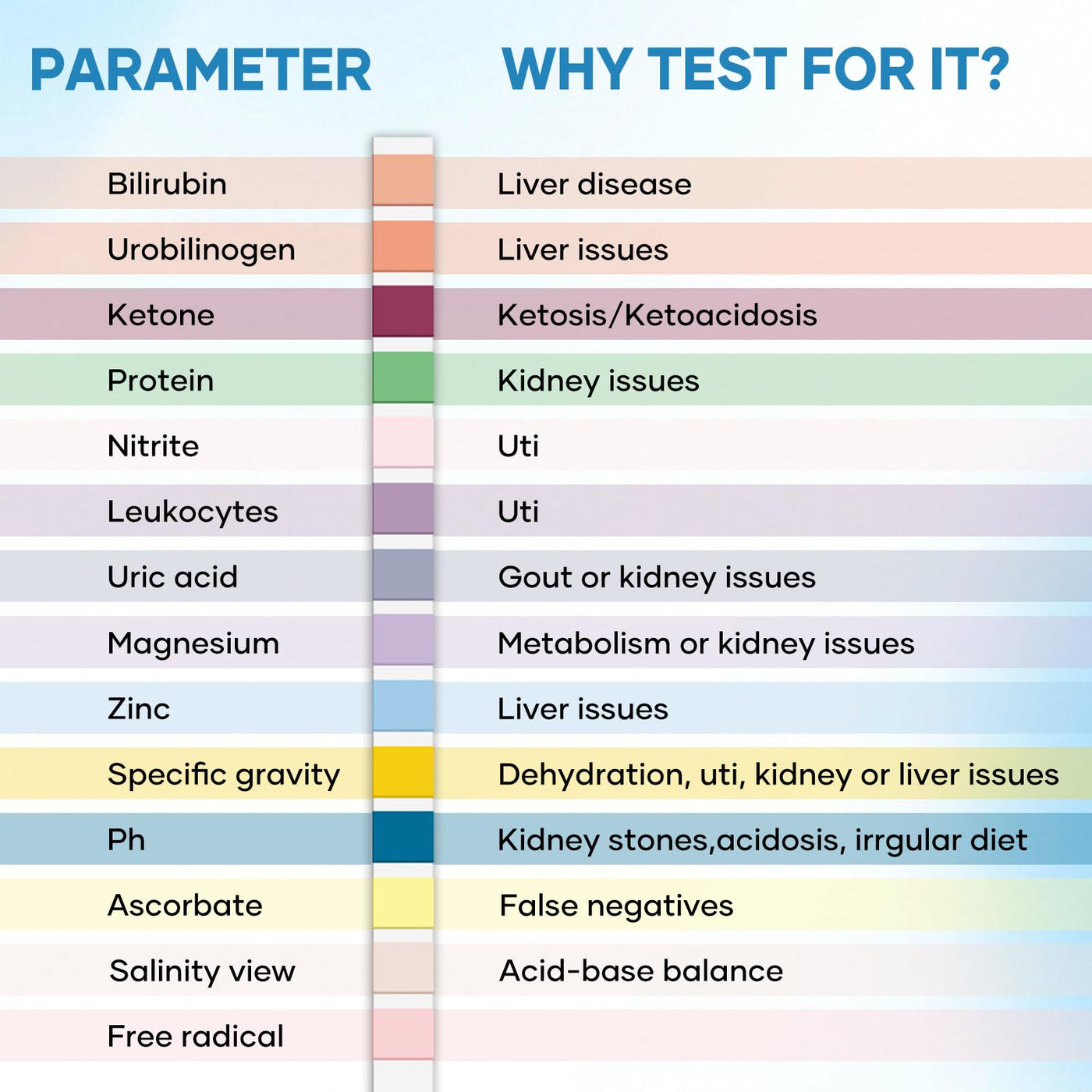 - Early Detection Gives us More Peace of Mind: Potential urinary tract infections(UTIs), kidney disorders, liver dysfunction and other urinary system abnormalities situations is something we need to be aware of on a daily basis; We can test these functional conditions with 14-Parameter urine test strips for uti infection