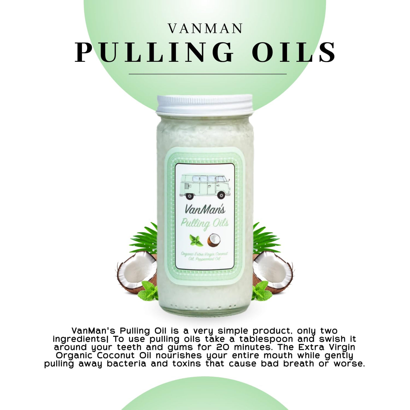 - Effortless Application: Use a tablespoon of Vanman's oil pulling coconut oil, swishing around your teeth and gums for 20 minutes to maintain oral freshness