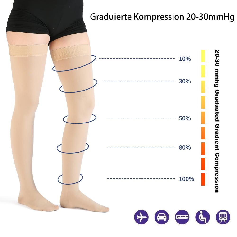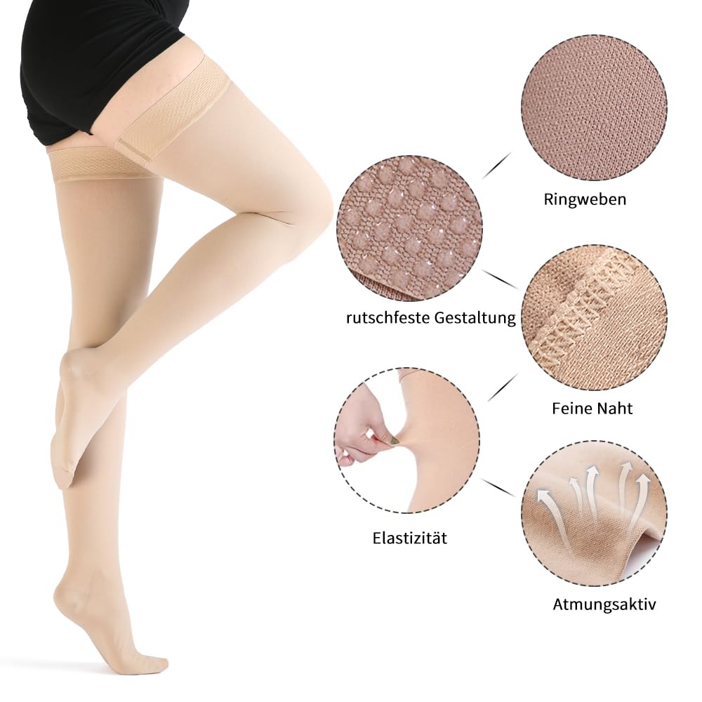 - High quality fabric: 70% nylon, 30% spandex. Innovative ergonomic technology combined with silicone bands along the upper edge of the compression stockings prevents rolling and slipping. The reinforced heel ensures long-lasting durability when worn.