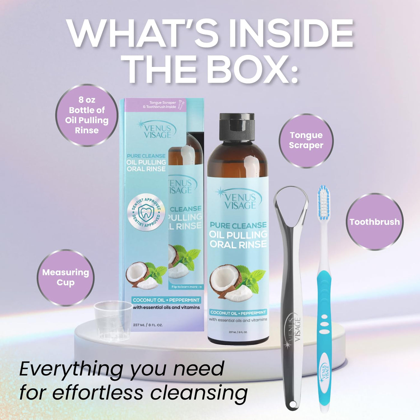 - The Complete Oral Care Kit - Everything you need for holistic oral hygiene is in our oil pull kit. Get 8 oz of peppermint & coconut mouth pulling rinse, tongue scraper, toothbrush, and measuring cup. Not satisfied? Just let us know, and well fix it!