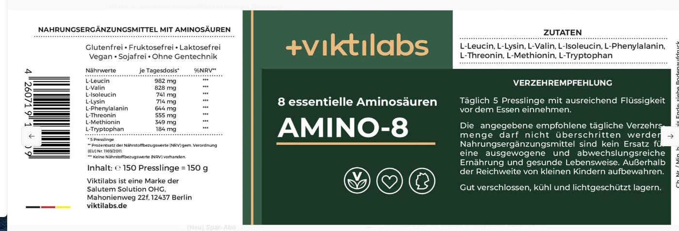 VIKTILABS - AMINO 8 [NEW] | High-dose amino acid complex - 998mg per pellet | EAA Vegan | All 8 essential amino acids (L-Tryptophan, l-Lysine...) | 150 tablets | 100% Natural