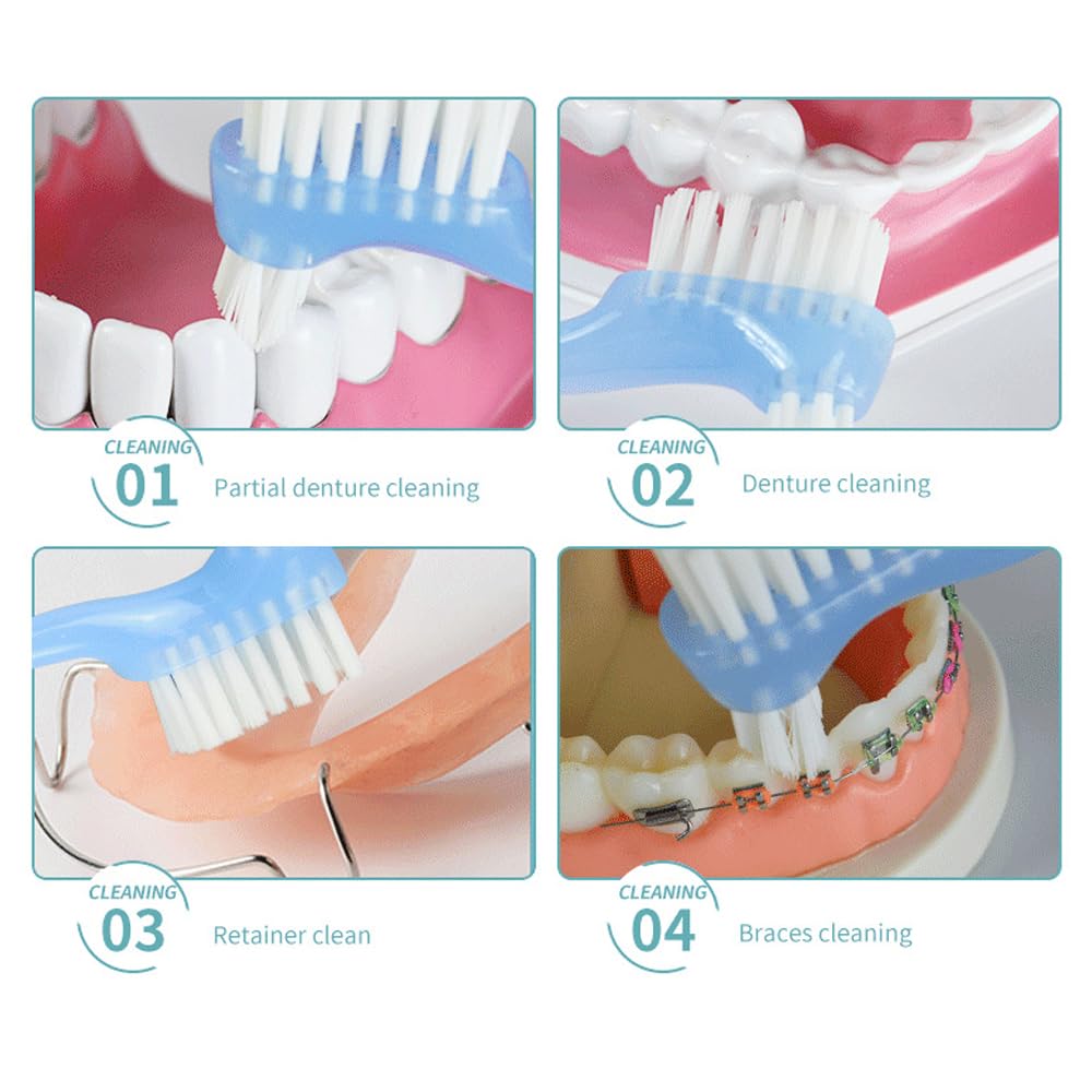 - Easy to use: The handle of the cleaning toothbrush is designed to fit in the palm of your hand, which is very considerate and easy to use. The multi-layered bristles and angled brush head can reach most parts of the dentures and effectively clean these teeth.