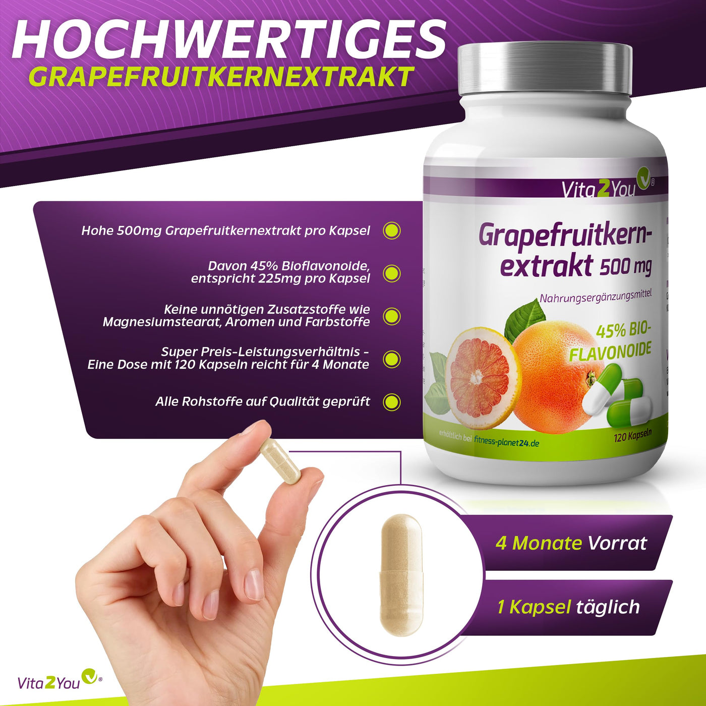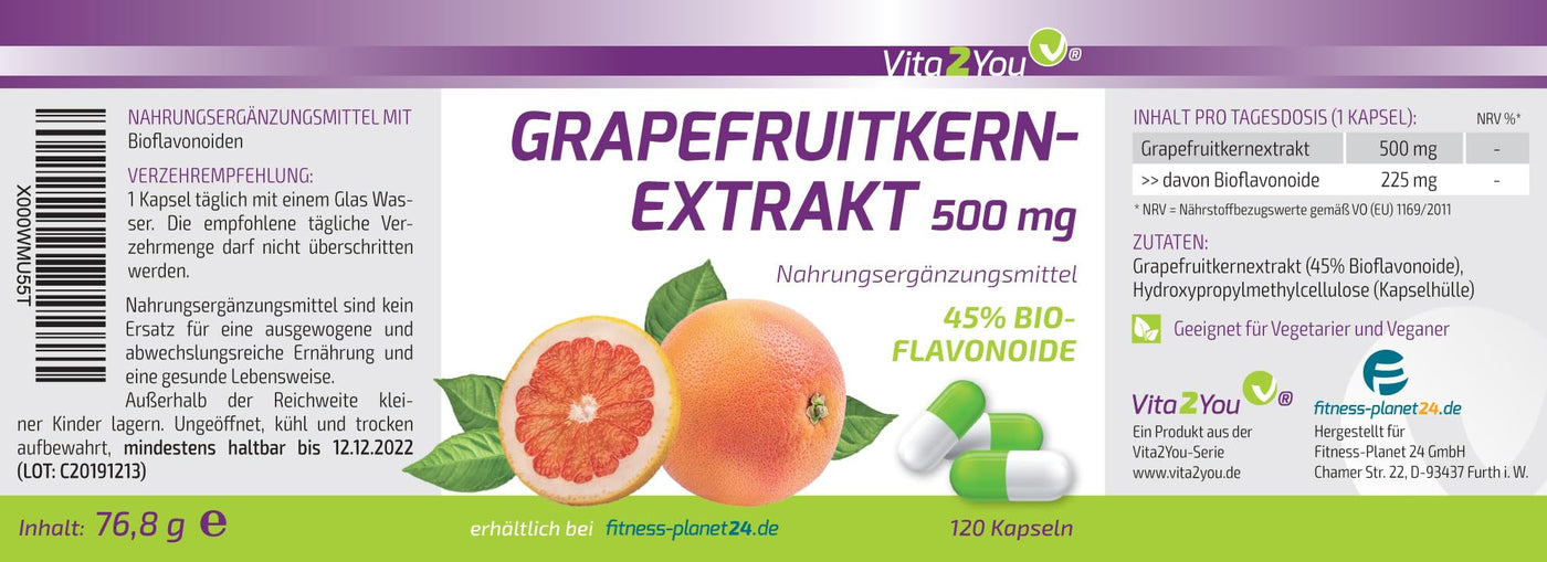 - VITA2YOU: Grapefruit seed extract from Vita2You delivers a high 500mg of grapefruit seed extract in just one capsule daily. Of which 45% organic flavonoids corresponds to 225mg. Significantly more flavonoids than in drop form.