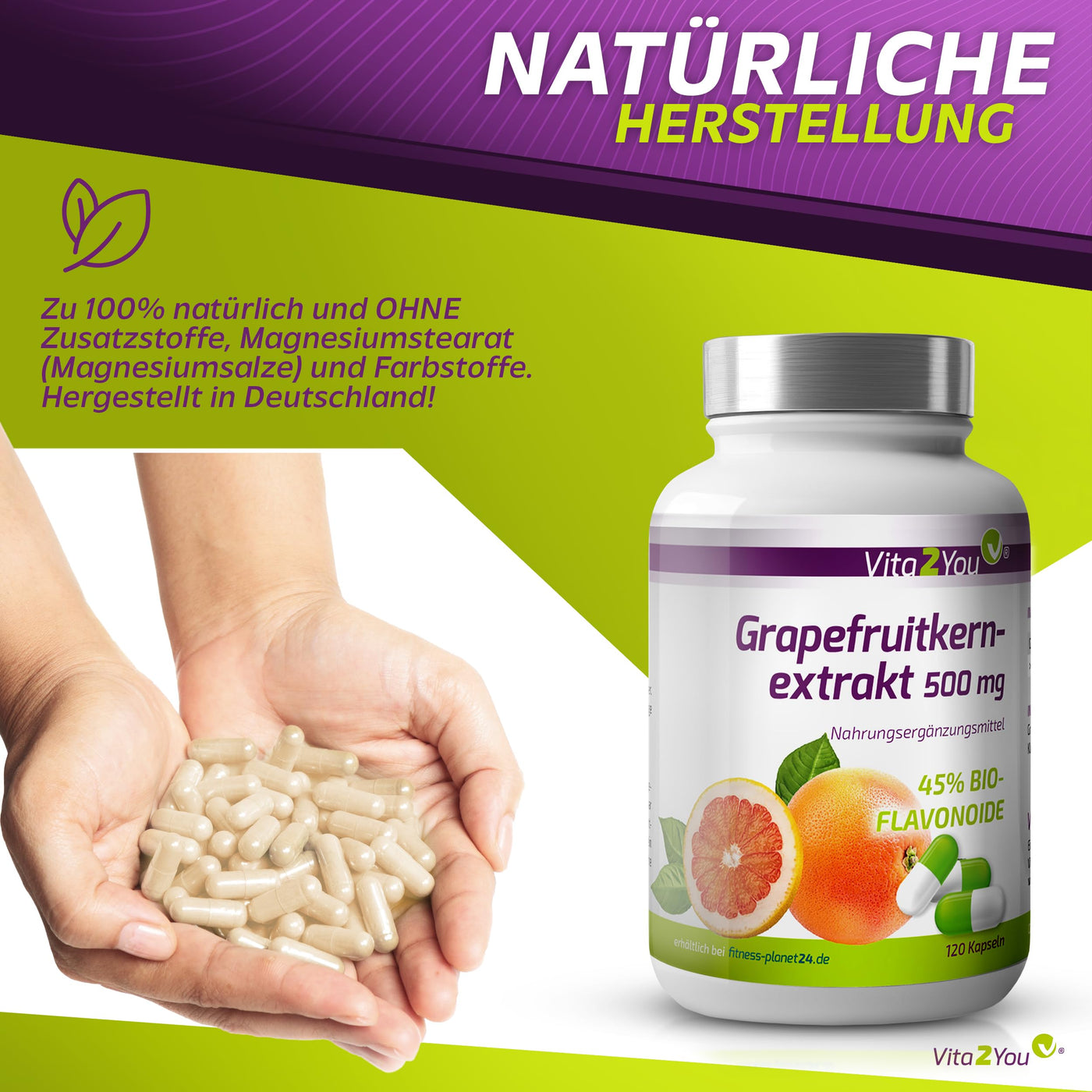 Product descriptions Vita2You - We love your health ► Trust us the Vita2You brand, because quality is our top priority. ► Ours Products are double sealed for your safety. ► Many Vita2You – Products have a marketability certificate, tested by Agrolab ► This product was manufactured under the strictest controls. ► Great price- Performance ratio. ► Contains no allergens. ► For vegetarians and vegans suitable. Ingredients / Ingredients Grapefruit extract (45% bioflavonoids), Hydroxypropylmethylcellulose (capsule shell) P.when('A').execute(function(A) { A.on('a:expander:toggle_description:toggle:collapse', function(data) { window.scroll(0, data.expander.$expander[0].offsetTop-100); }); }); Instructions for use 1 capsule daily with a glass of water. The recommended one daily consumption amount must not be exceeded. Warnings outside Keep out of the reach of small children. Dietary supplements are not Replacement for a balanced and varied diet and healthy Way of life. More
