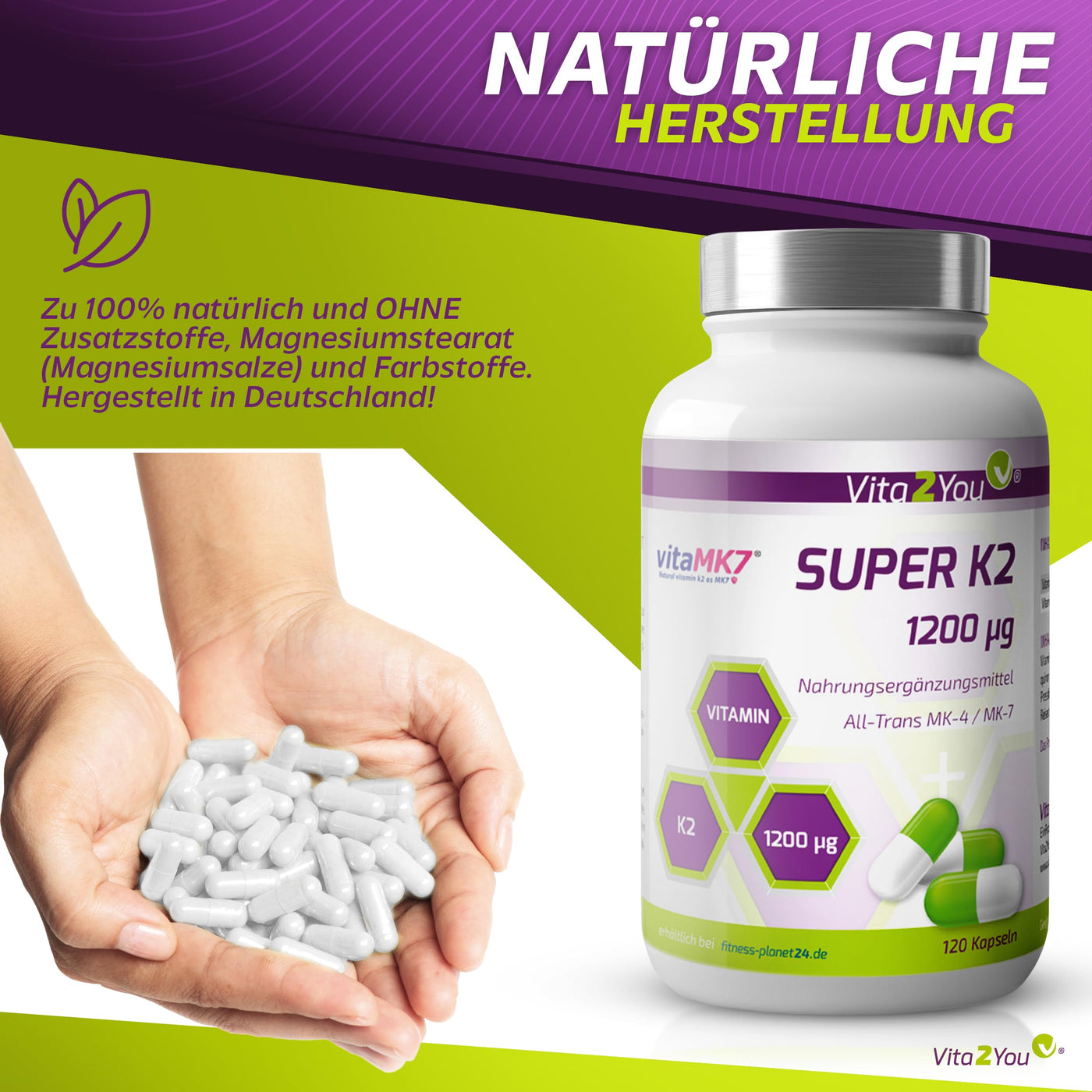 - VITA2YOU: Super K2 from Vita2You provides 1200g of vitamin K2 (200 Mk7 and 1000g Mk4) in just one capsule daily.