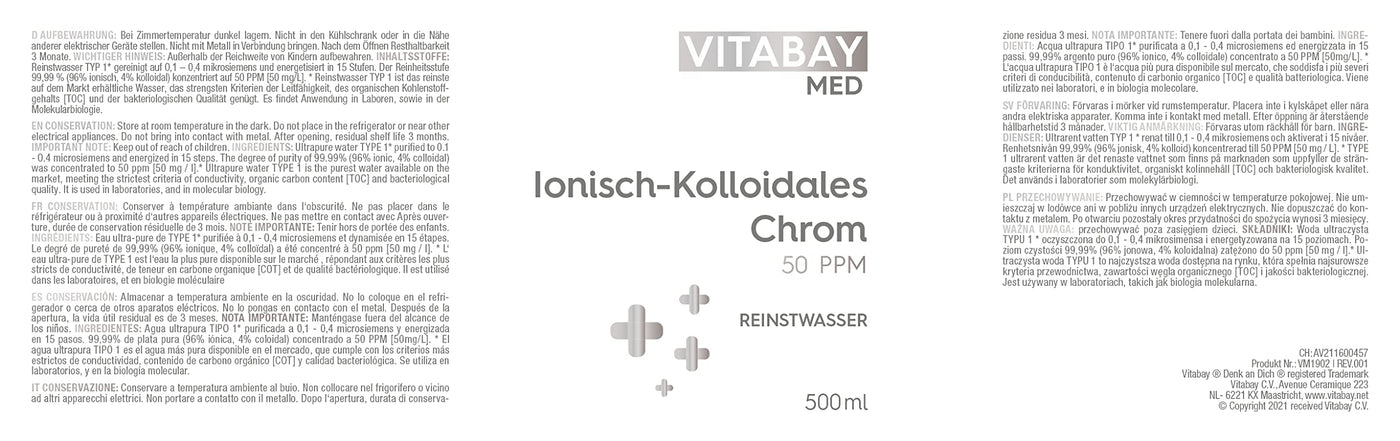 - PURE PURITY Vitabay Colloidal Chromium 50 PPM has a purity of 99.99%. Without any other additives such as chlorides, proteins or salts. It also contains the optimal proportion of positively charged ions and is produced with distilled ultra-pure water (Type 1 purified to 0.1-0.4 microsiemens and energized in 15 stages).