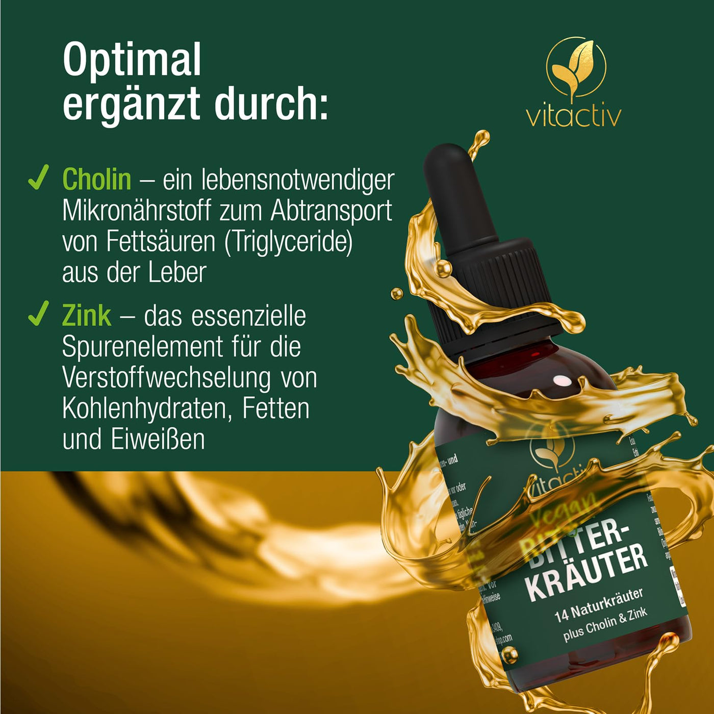 - BITTER DROPS WITH ZINC & CHOLINE: Zinc supports the normal metabolism of fatty acids, carbohydrates and protein synthesis. Choline for normal fat metabolism and normal liver function.