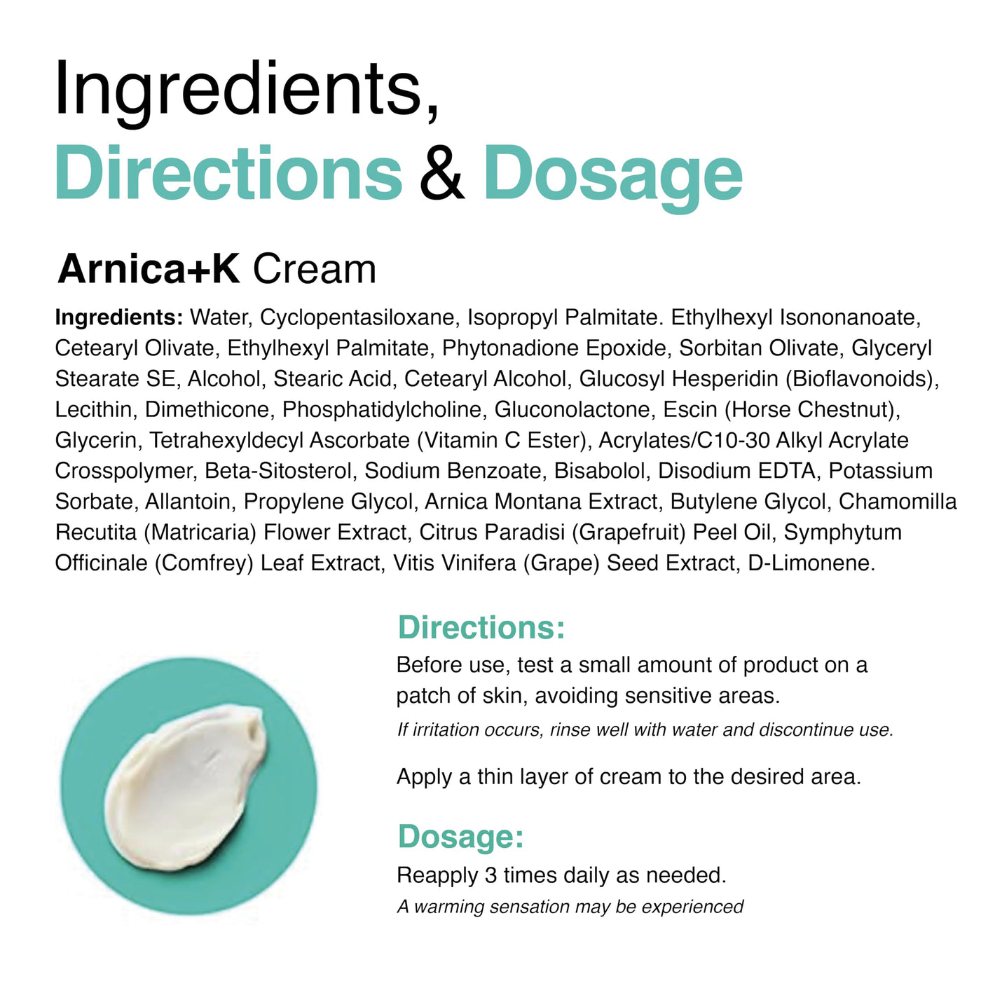- Arnica Cream with Vitamin K: Featuring arnica montana, vitamin K1 oxide, vitamin C, and horse chestnut to help moisturize and restore skin faster.