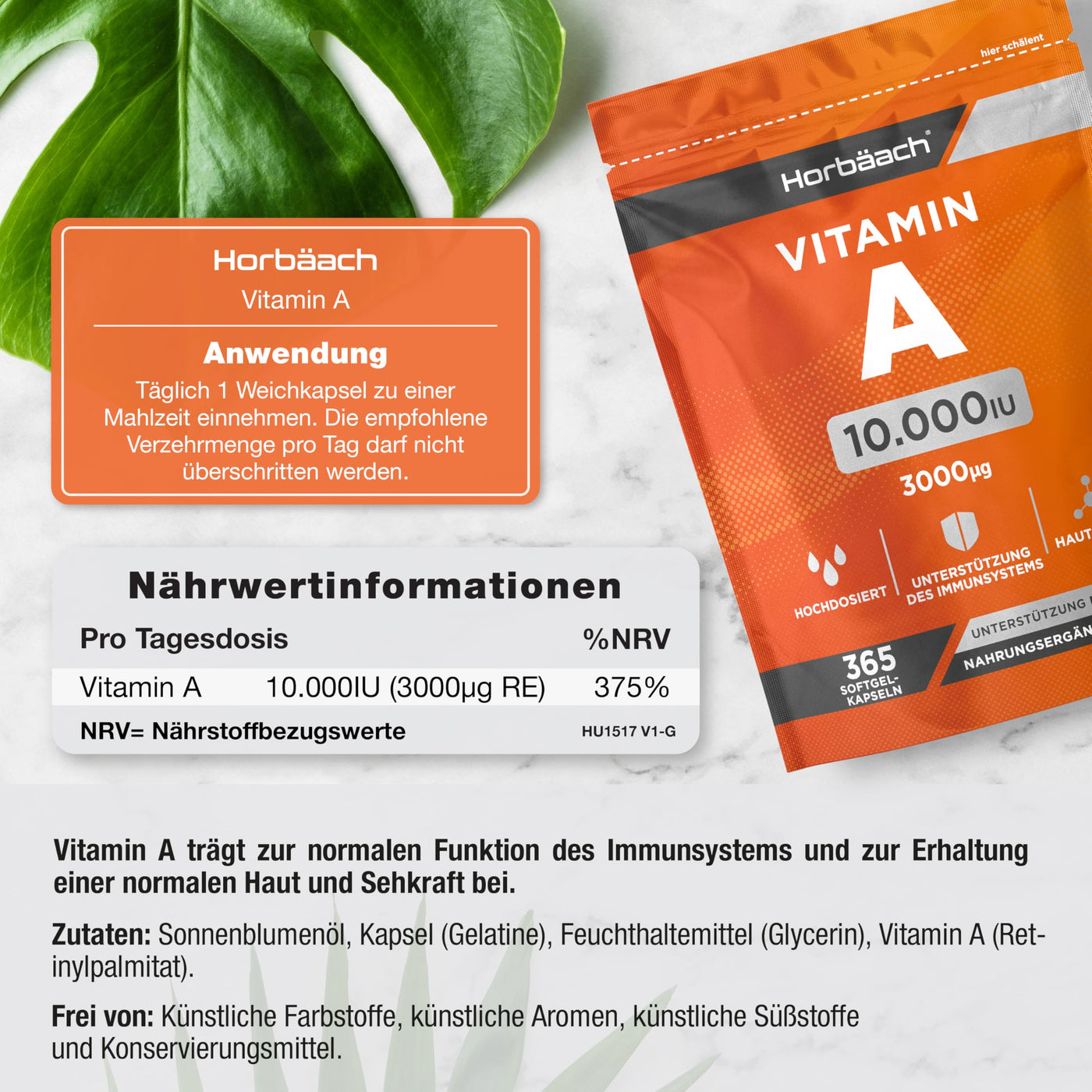 Vitamin A high dose 10000 IU | 1 year supply | Eye vitamins | Retinol for skin, cells & immune system | Horbaach