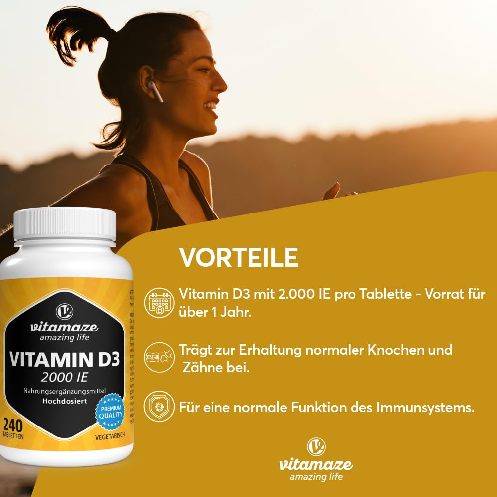 Product descriptions Vitamaze | Amazing life: Vitamin D3 2,000 IU tablets While other vitamins can be obtained through food, Vitamin D is produced by the body itself. Just from the sun's rays (UVB rays) the skin can produce the vitamin itself. In Central Europe the sun is only strong enough in the summer months (sufficient UVB rays), that the body can produce enough vitamin D3. In closed rooms or As we age, the skin doesn't get enough sun and the body doesn't produce enough too little vitamin D3. A deficiency arises. 240 tablets with 2,000 IU (international units) per tablet, 1 tablet every other day covers the recommended daily requirement. Ingredients/Ingredients Filler: Microcrystalline cellulose; Cholecalciferol. P.when('A').execute(function(A) { A.on('a:expander:toggle_description:toggle:collapse', function(data) { window.scroll(0, data.expander.$expander[0].offsetTop-100); }); }); Instructions for use Take 1 tablet every 2 days with enough water. Warnings The stated recommended consumption amount must not be exceeded become. Dietary supplements are not a substitute for a balanced and varied diet and a healthy lifestyle. For children and Not suitable for young people. The product is unopened, cool, dry and keep out of the reach of children. During pregnancy and breastfeeding should generally be avoided before consuming nutritional supplements a doctor should be consulted. Best before end / lot number: see Can bottom. More