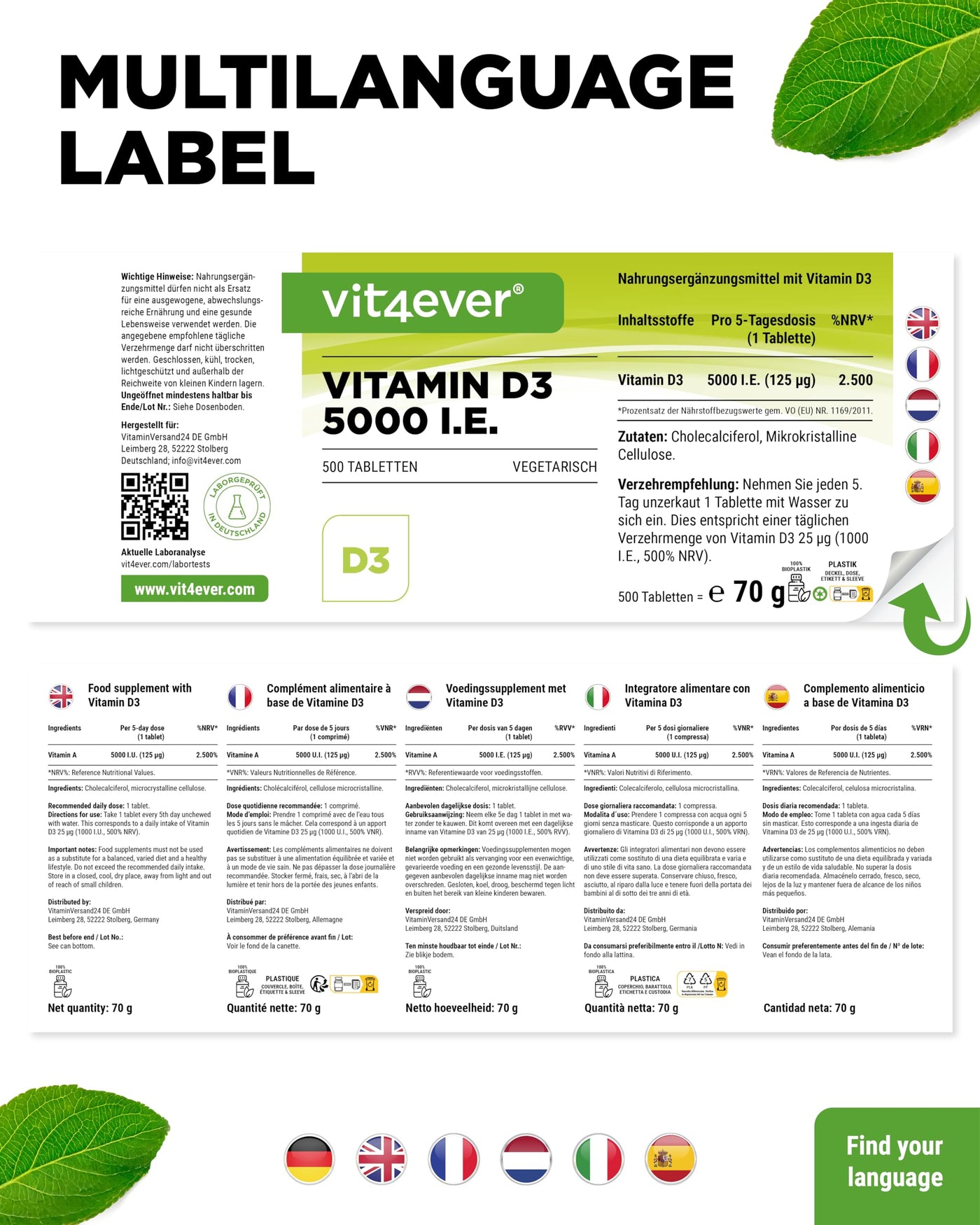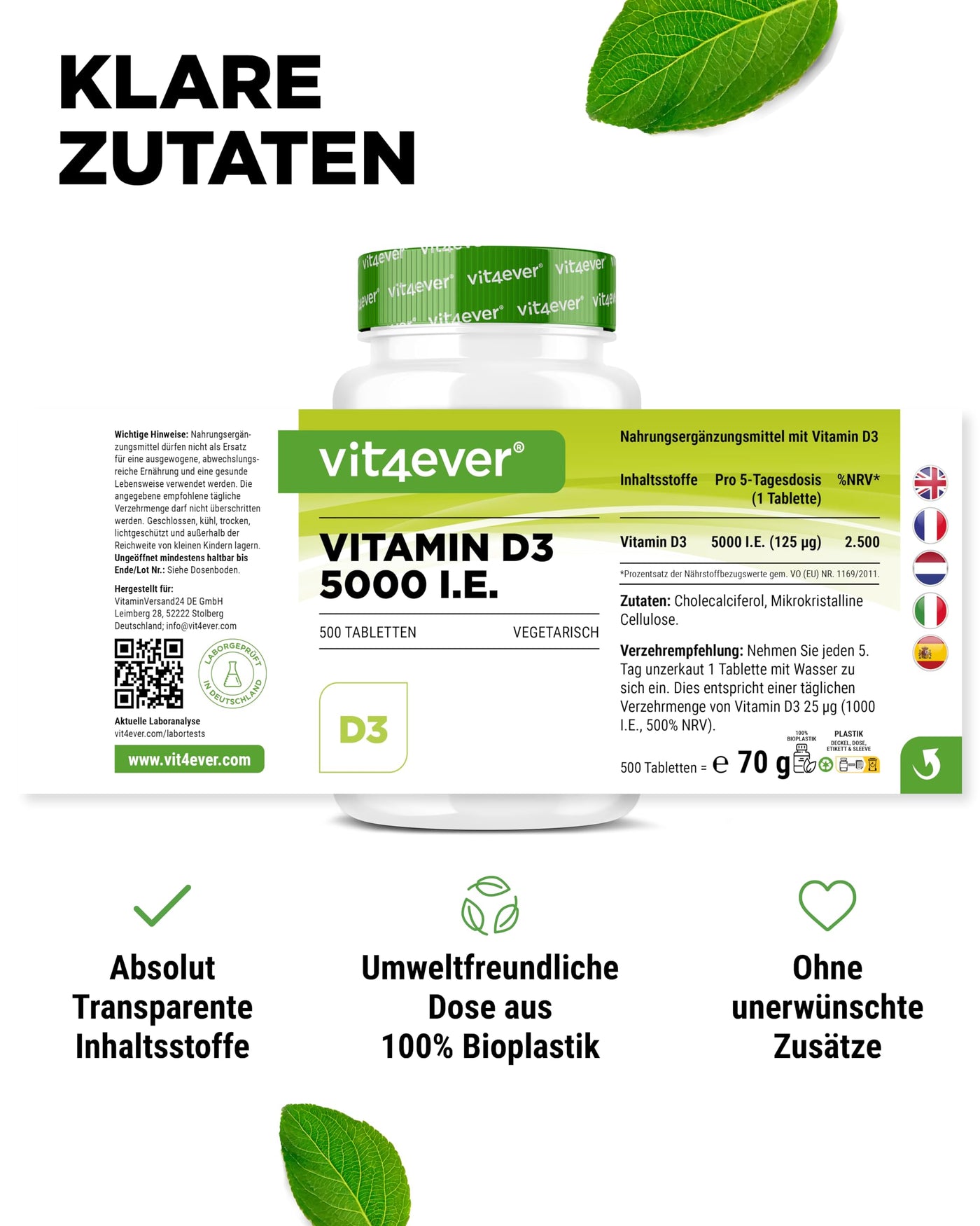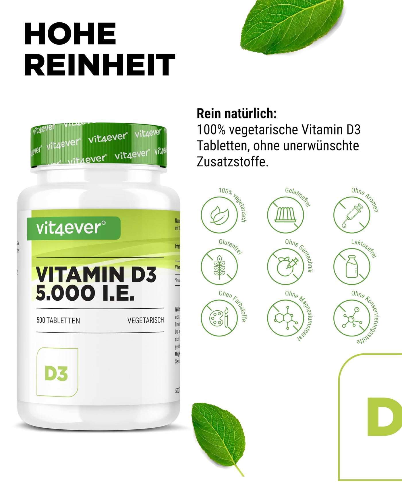 - VEGETARIAN & WITHOUT UNWANTED ADDITIVES: Our vitamin D3 tablets contain no unwanted additives & are 100% vegetarian. The tablets are free of magnesium stearate, flavors, colors, stabilizers, gelatin and of course also GMO-free, lactose-free, gluten-free & without preservatives.