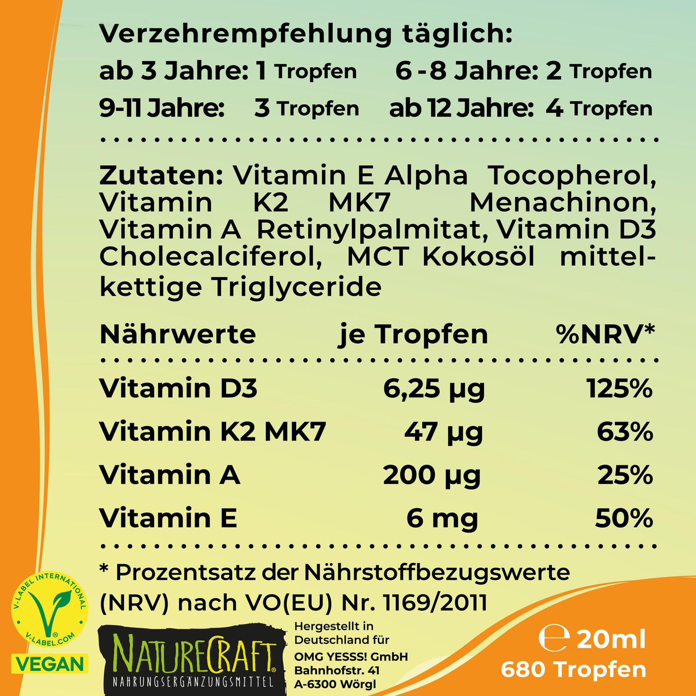 Vitamin D3+K2 KIDS with vitamin A & E, Vegan - dosed for children from the age of 3 to adulthood - for the whole family - neutral in taste (20ml = approx. 6 to max. 22 month supply)