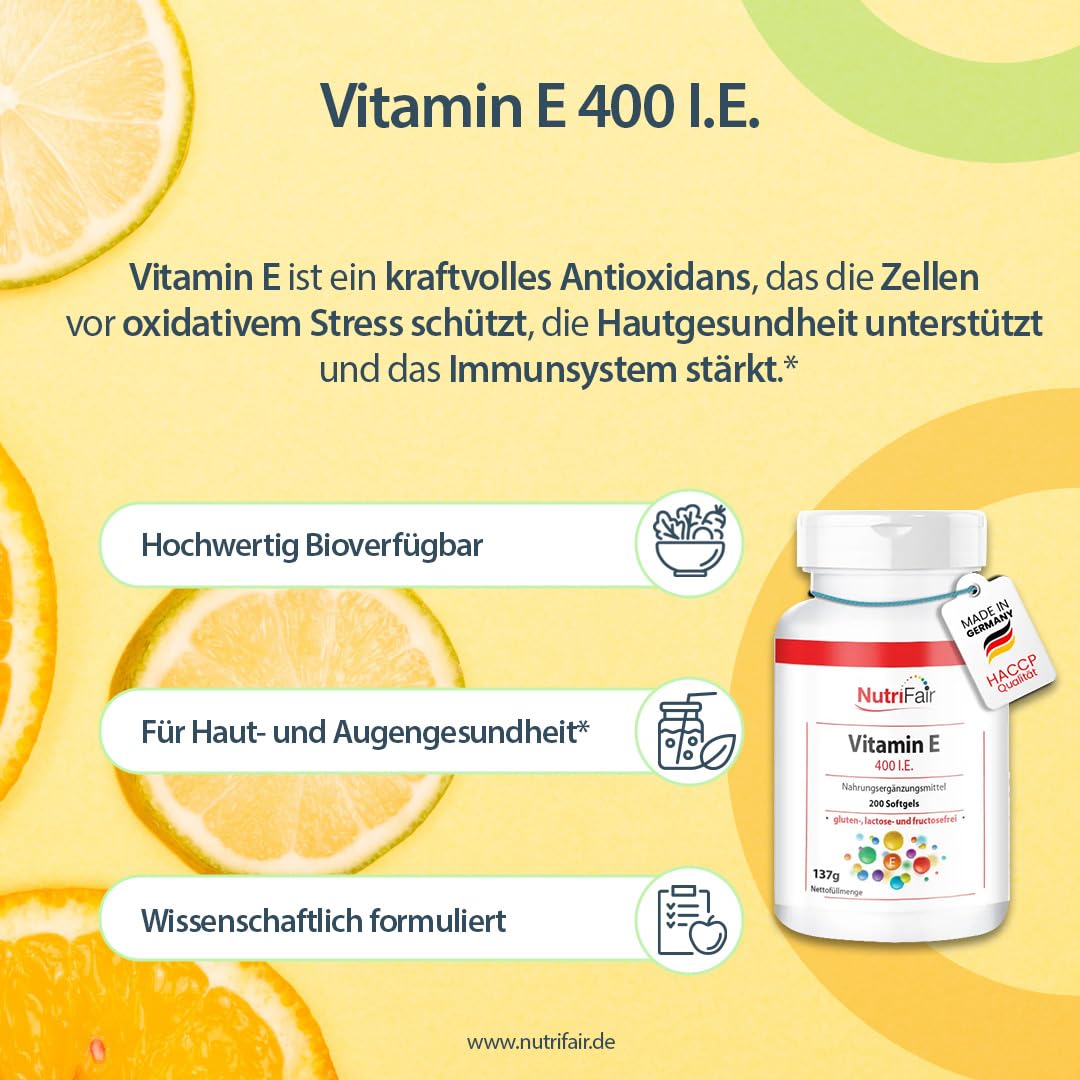 Vitamin E 400 IU - with 268mg vitamin E per softgel - 200 softgels - high dosage - German production & Laboratory testing - NutriFair | Premium & Fair