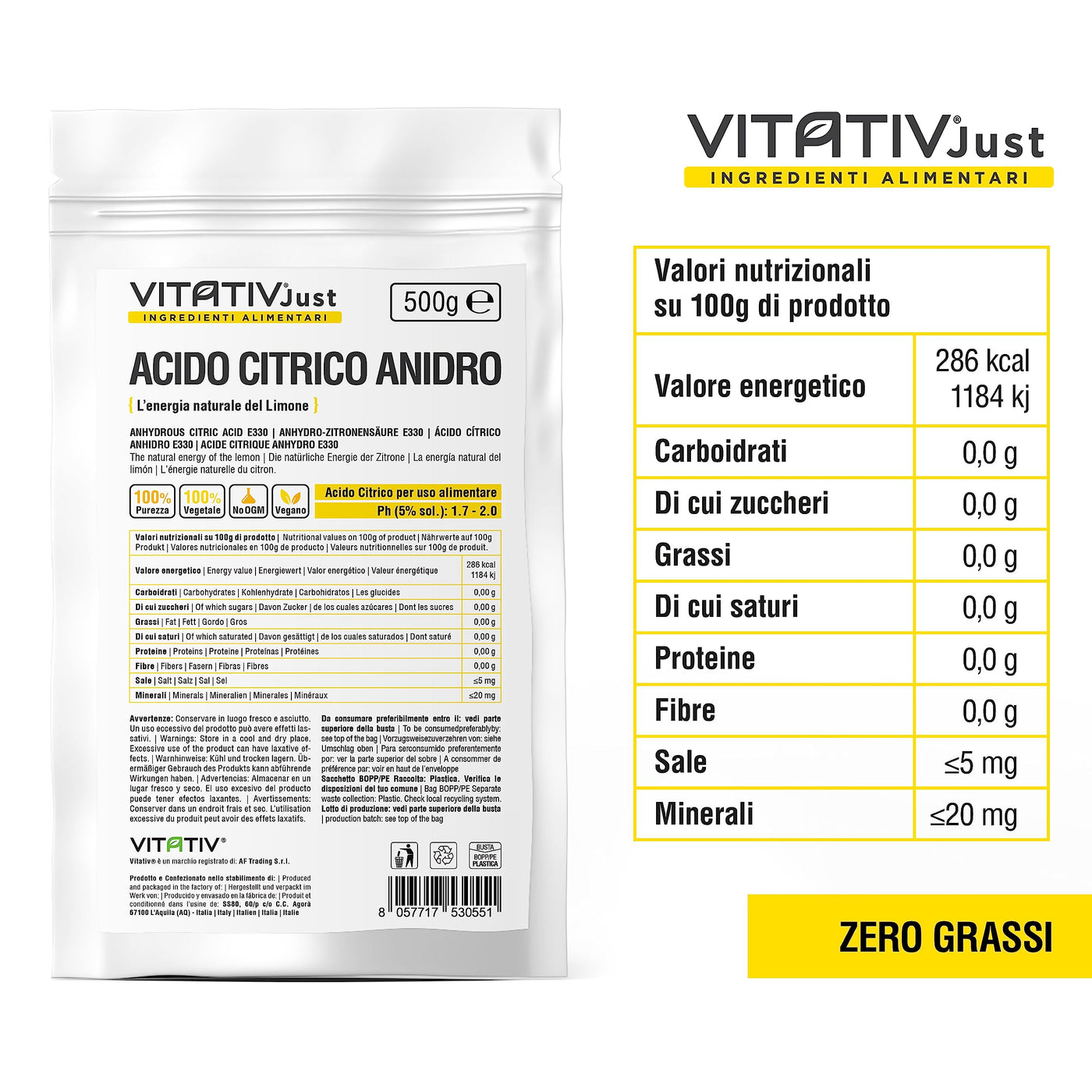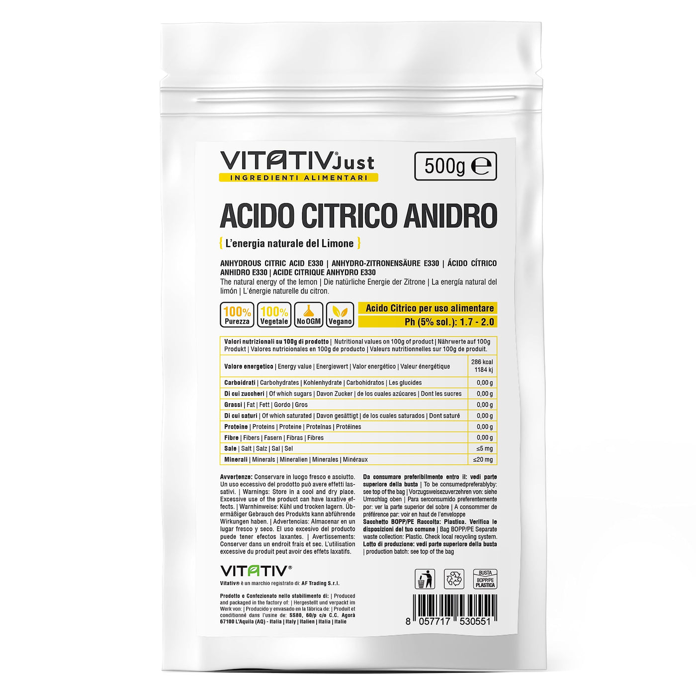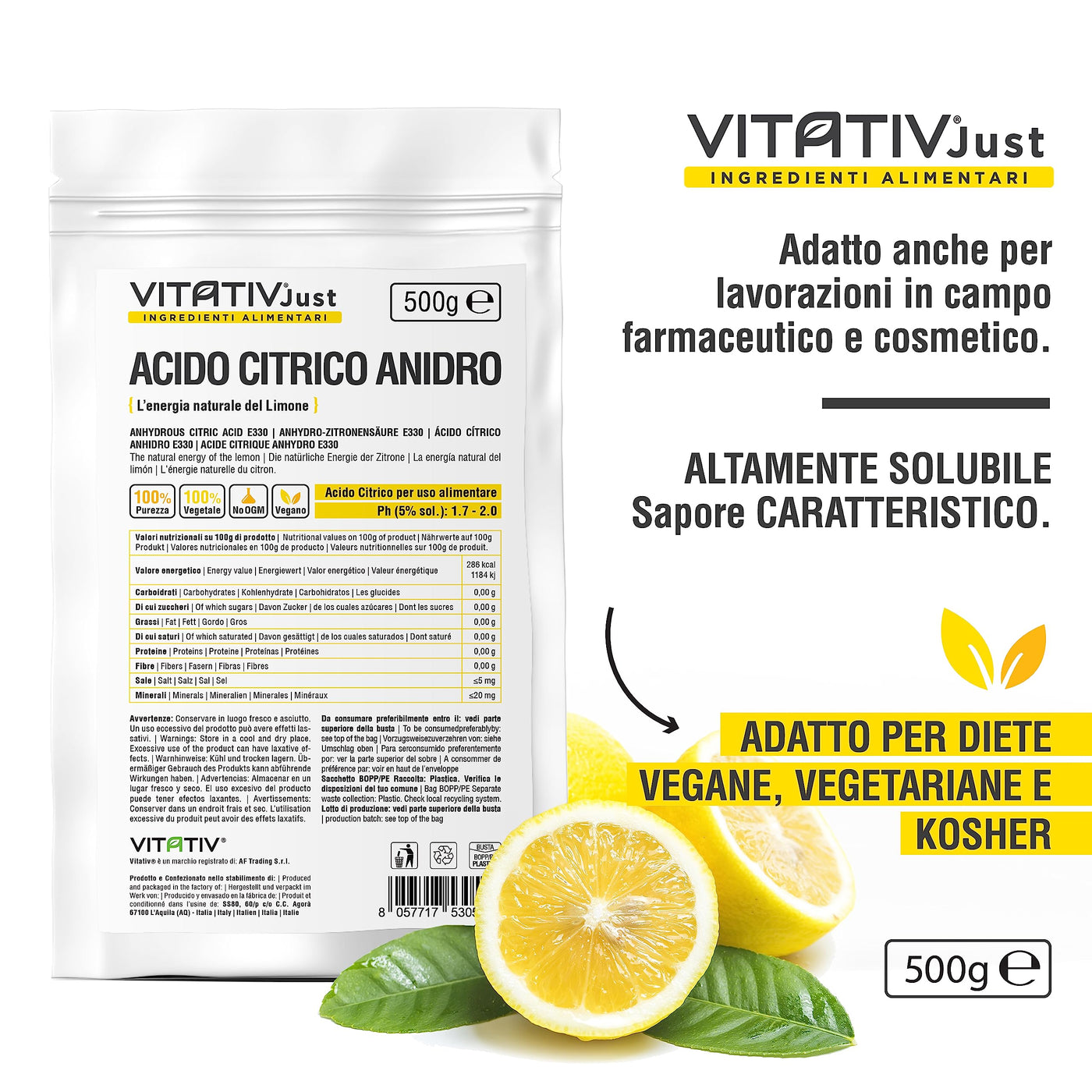 - Citric acid VITATIVE | Citric acid anhydrous 100% pure powder in fine powder, suitable for vegetarian, vegan and kosher diets. Gluten-free, transgenic and anti-caking agent free, Vitativ's citric acid E-330 respects your health and nutritional needs.