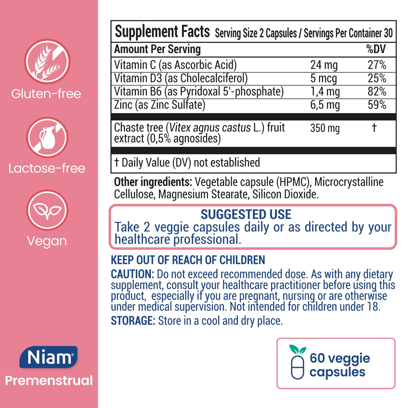 - PREMIUM VITEX AGNUS CASTUS (CHASTEBERRY) EXTRACT Each serving of Niam Premenstrual delivers 350 mg of high-quality Vitex agnus castus extract, equivalent to 1400 mg of fruit, standardized to 0.5% agnusides. A traditional botanical used to support womens wellness throughout the monthly cycle.