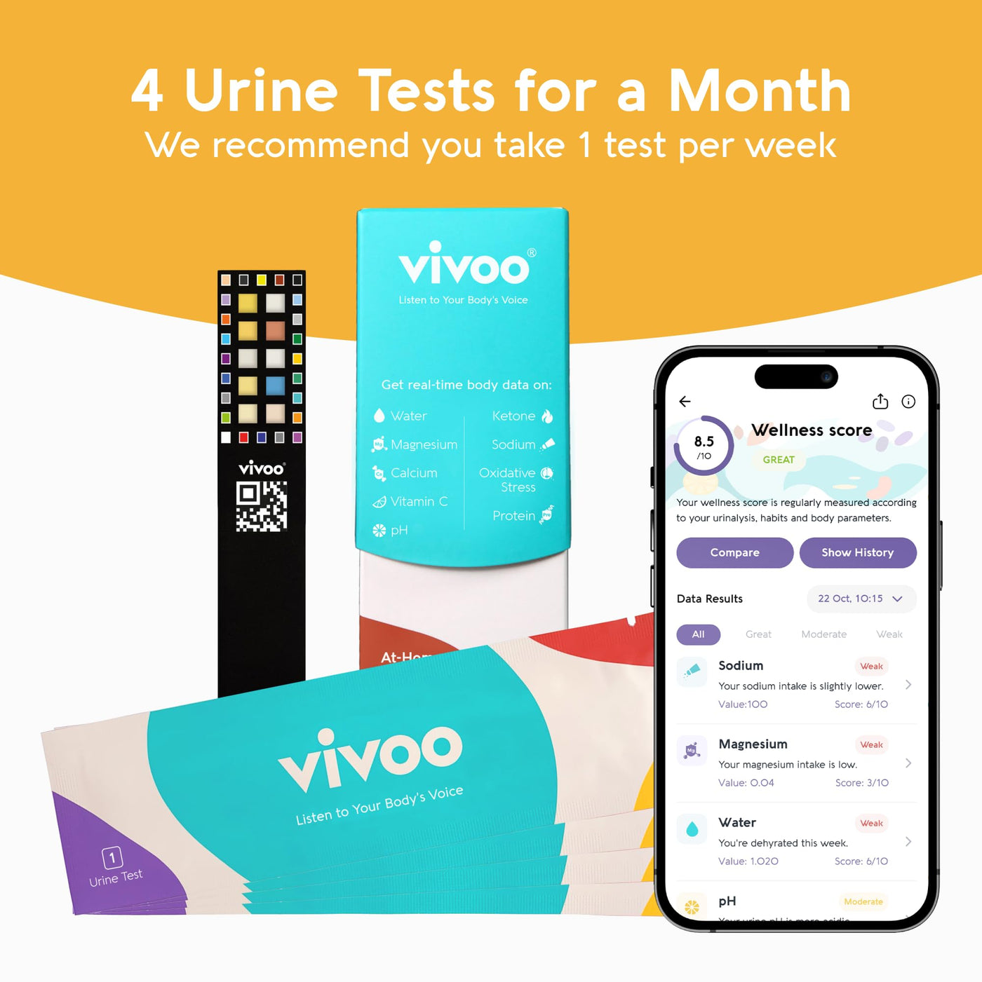 - WELLNESS TEST ANYTIME, ANYWHERE Take your hydration test, sodium test, or ketone urine test anytime, at home, after workouts, or while traveling. The Vivoo App instantly scans your urine test strip and delivers easy-to-understand feedback. Ideal for anyone who wants a quick, non-invasive water test and wellness tracker that fits into a busy lifestyle.