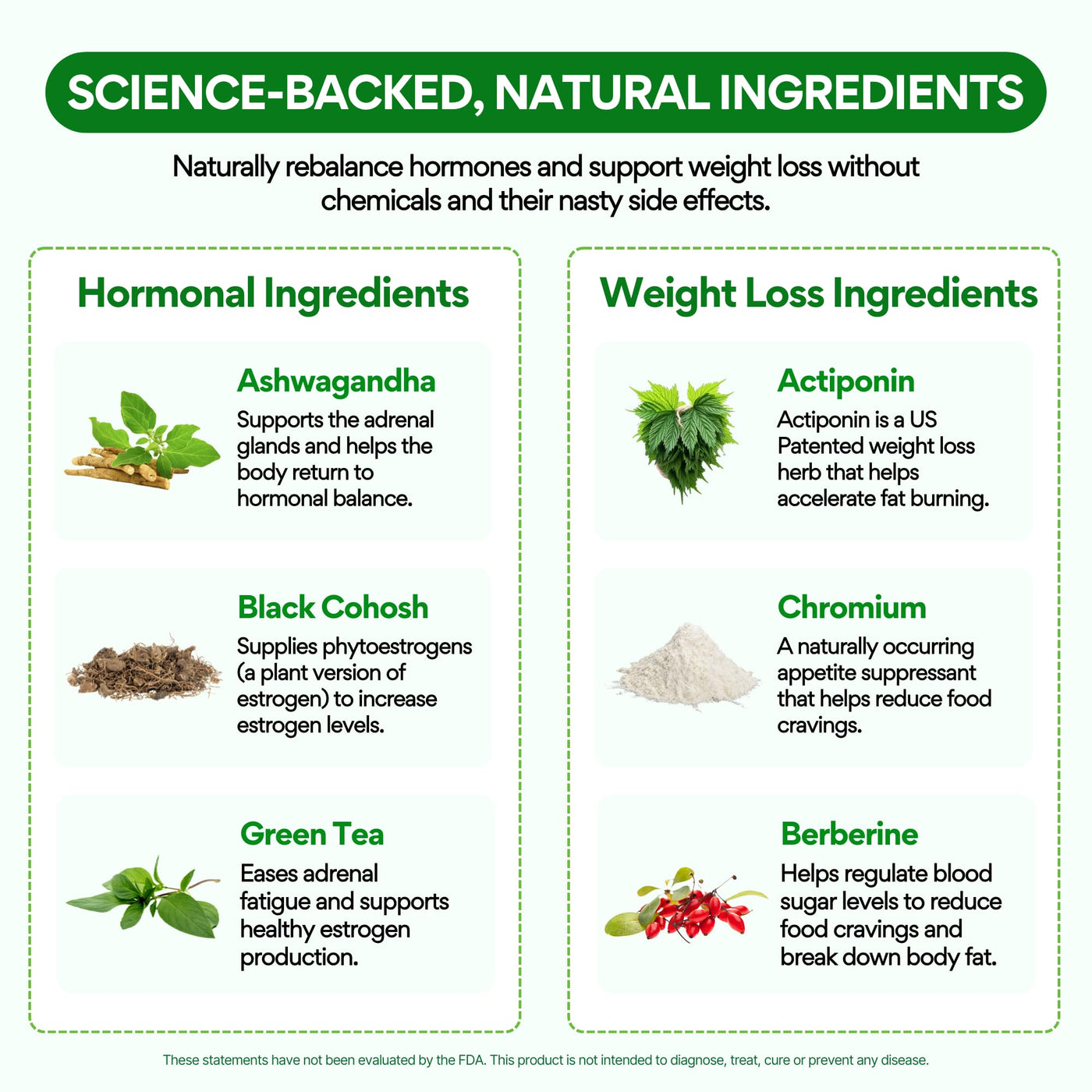- Hormone Balance for Women At Any Stage of Menopause - With natural hormonal balancing ingredients such as Black Cohosh & Ashwagandha, MenoSlim Advanced supplements estrogen to help alleviate hot flashes, night sweats, mood swings, brain fog & more.
