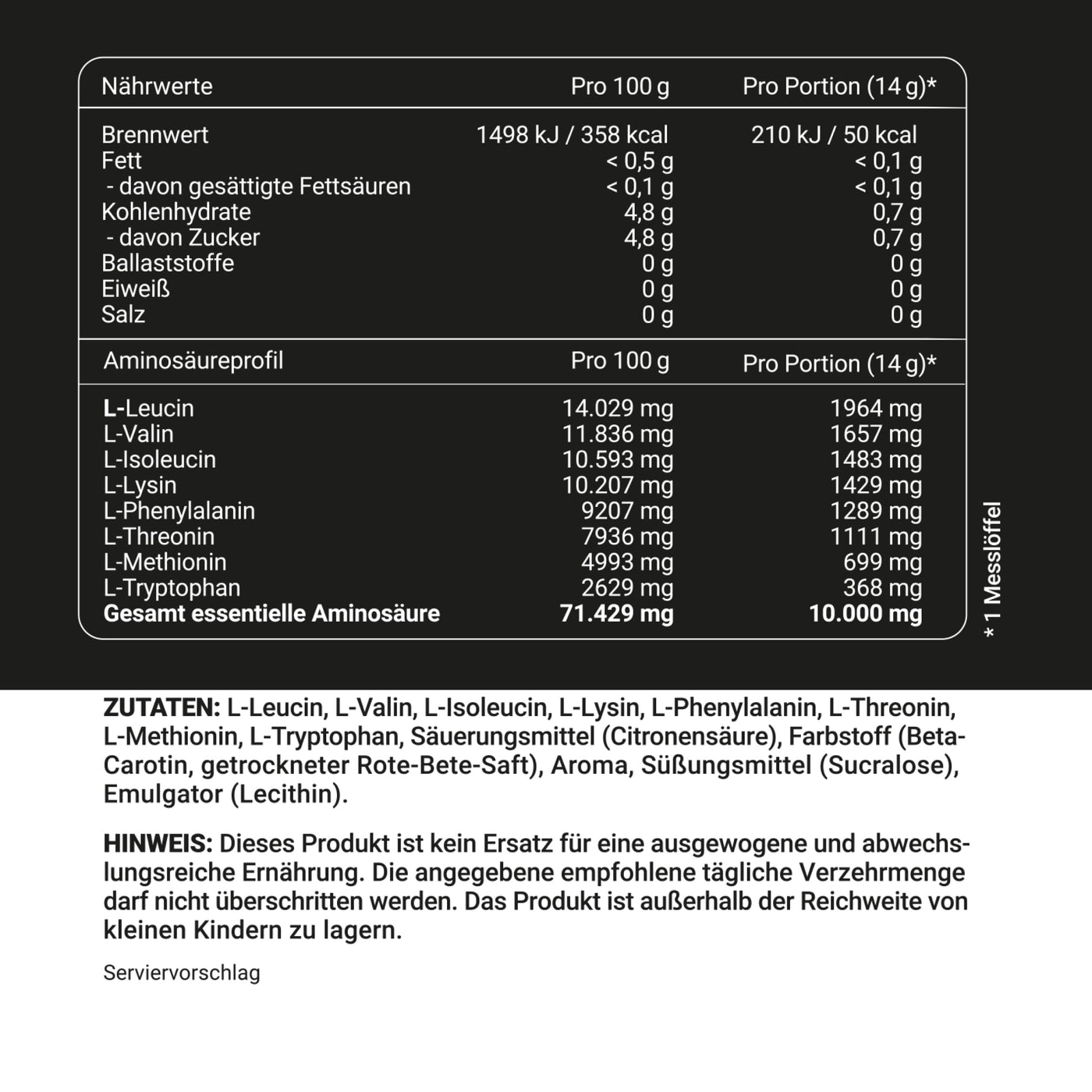 - ULTRA FINE POWDER: A portion of EAA powder (14 g, measuring spoon included) can be easily mixed thanks to the excellent solubility of the ultra-fine powder. One can is enough for approx. 35 servings.