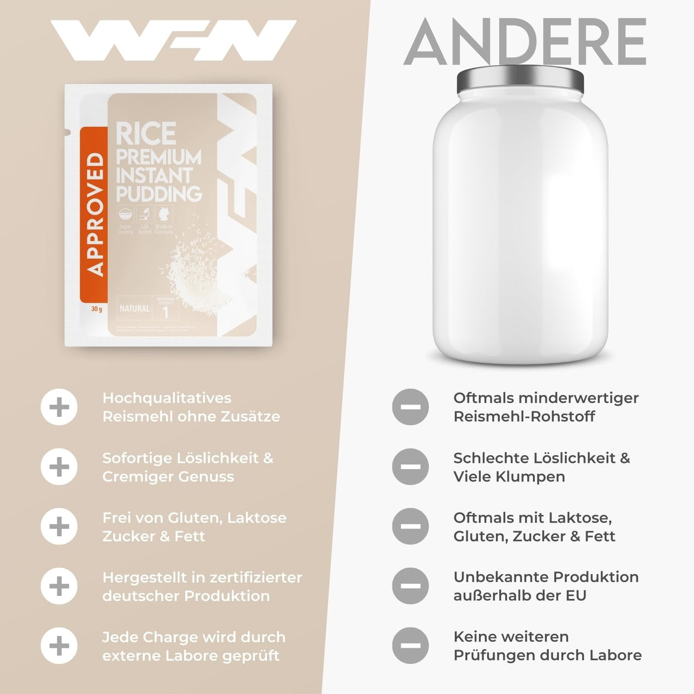 - LABORATORY TESTED - Like every supplement from WFN, the Approved Rice Pudding is made exclusively in Germany. Each batch produced is tested for microbiology and heavy metals by an independent, accredited laboratory.