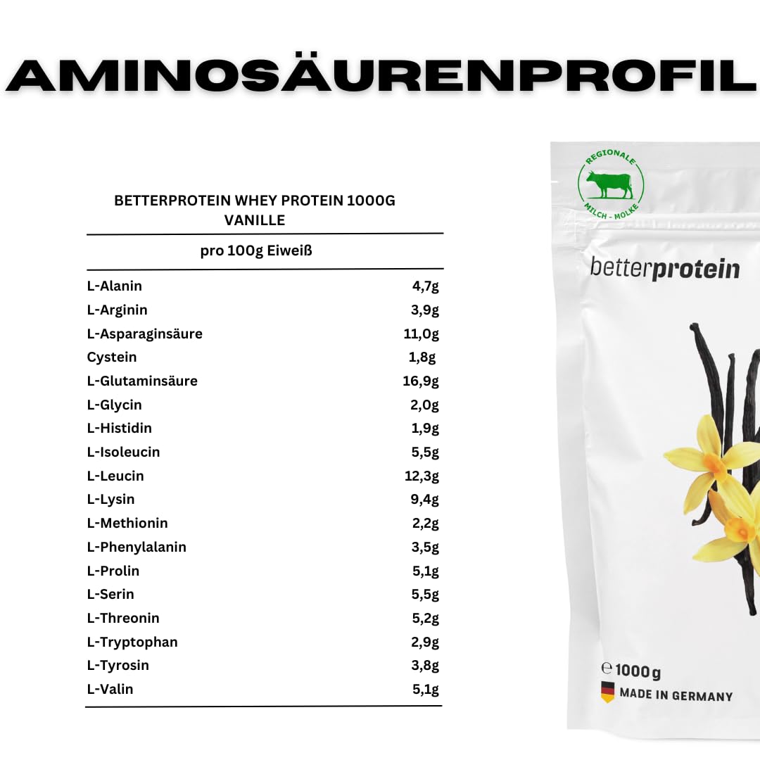 Whey Protein - Vanilla 1 kg - Produced in Germany from regional milk - BetterProtein® - Protein powder for building muscle and losing weight - Bag