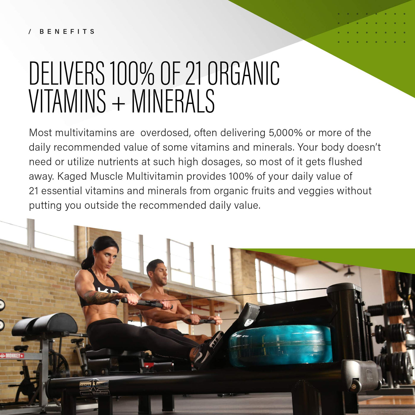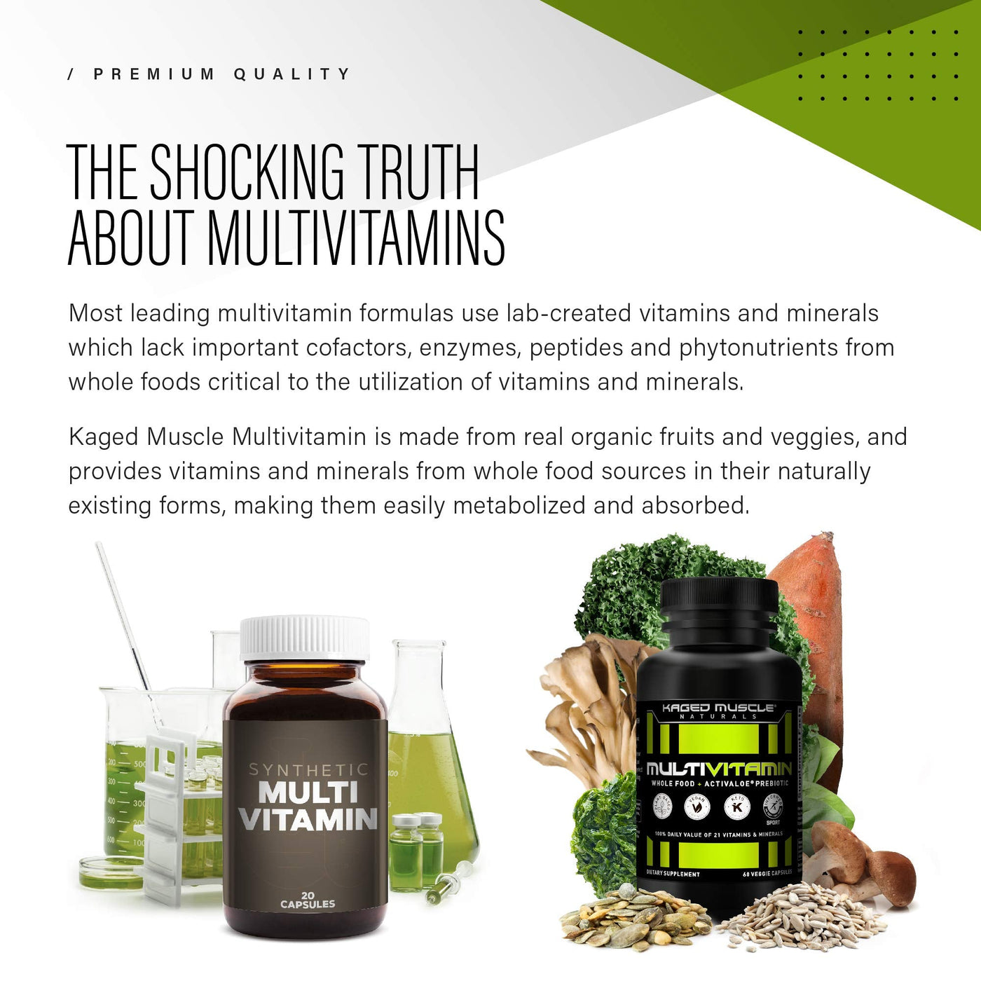 - MADE FROM REAL ORGANIC FRUITS + VEGGIES: Most multivitamin for women and multivitamin for men are made with synthetic vitamins and minerals from chemicals. Kaged Muscle Multivitamin is made from 100% organic fruits and veggies.