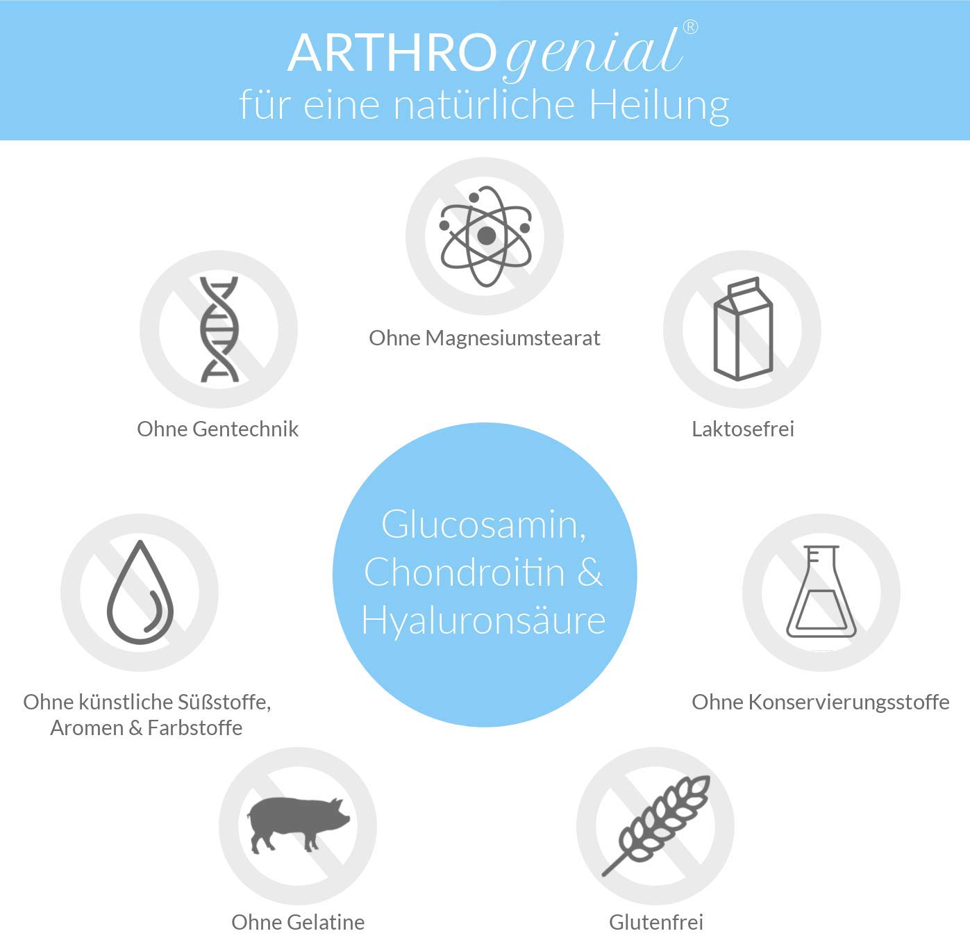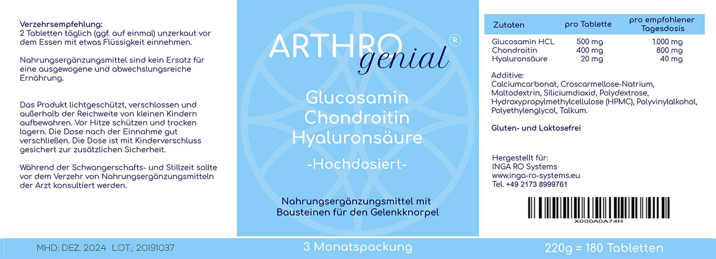 *WITHOUT MAGNESIUM STEARATE* ARTHRO genius® - Glucosamine Chondroitin Hyaluronic Acid high dose - 180 tablets - 1500 mg