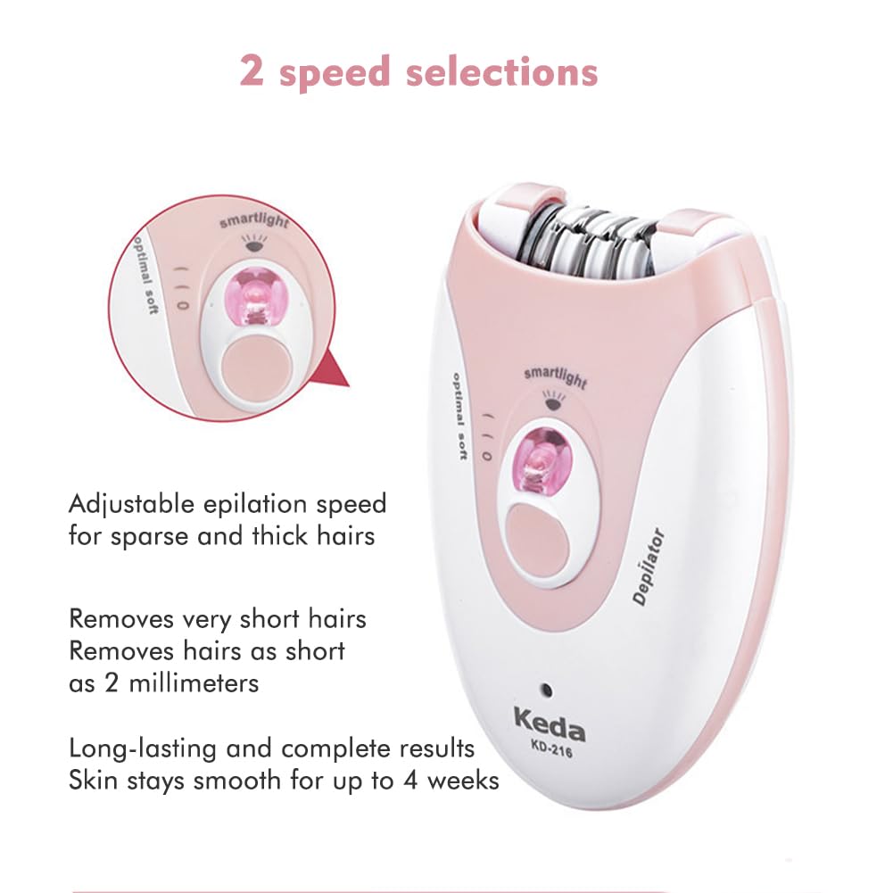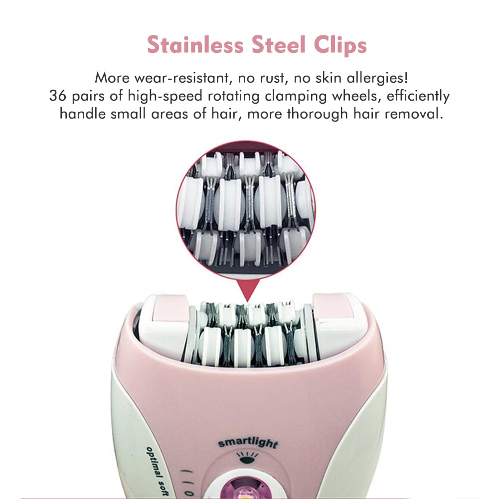 - LED light designThe women's epilator is made of ABS body and stainless steel blades, built to last. With a smart LED light that provides good lighting for you to remove tiny hairs even in a dark environment, so you won't miss a hair.