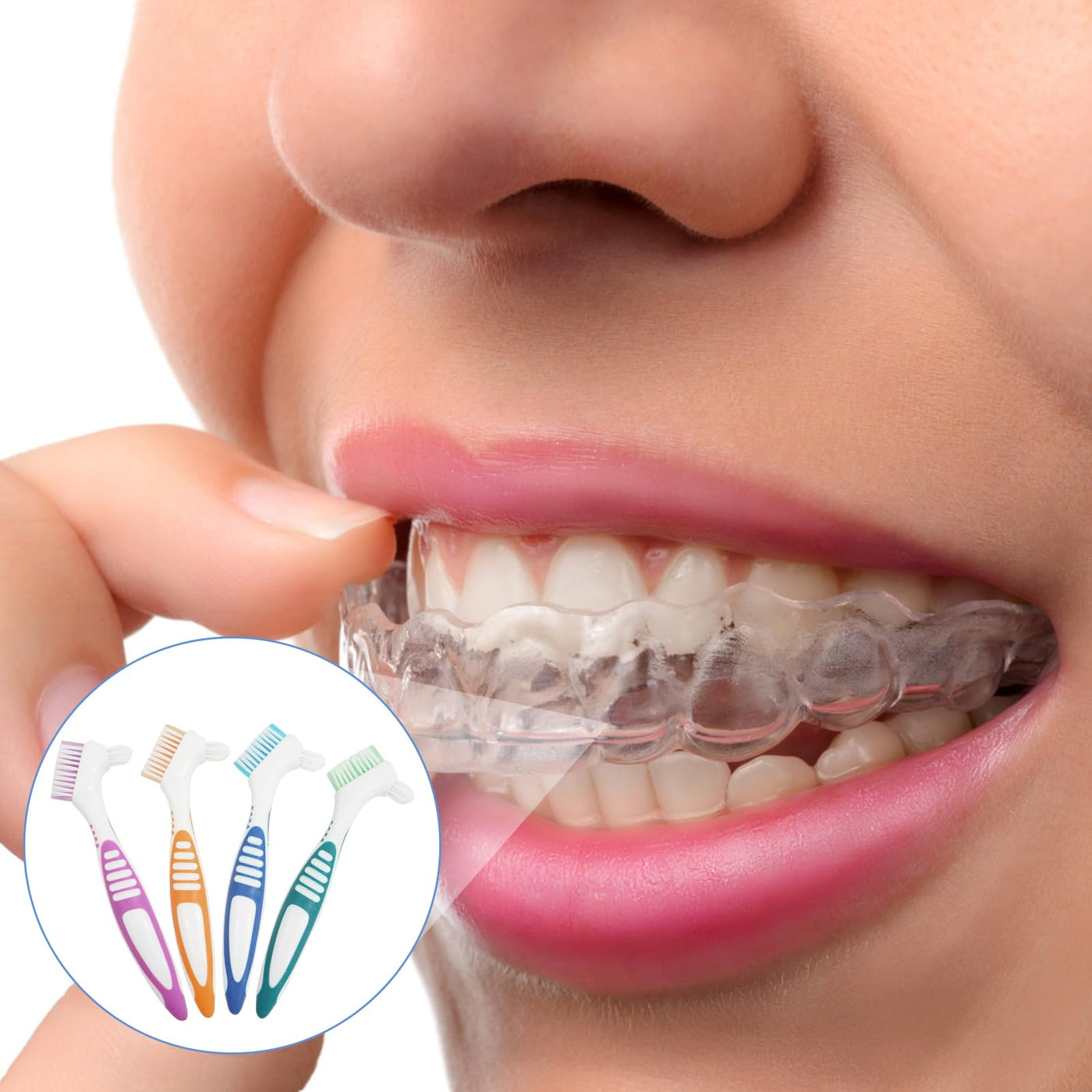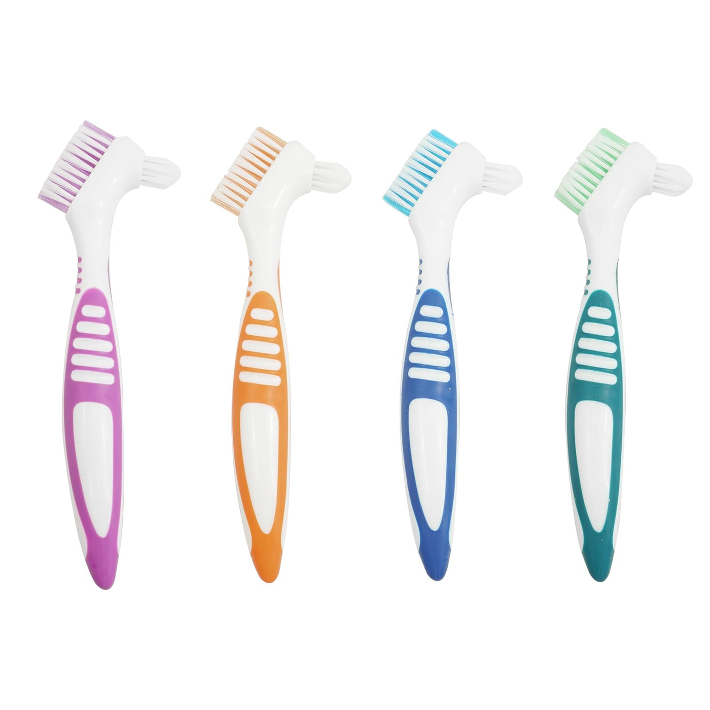 Our denture brush set is perfect for effectively cleaning Dentures, braces, false teeth and more. This set contains 4 portable denture brushes with double bristle heads in bright colors Blue, purple, green and orange.